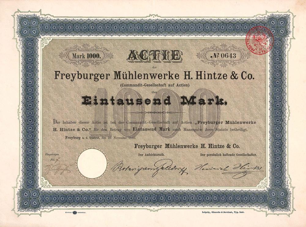 A-73809Freyburger Mühlenwerke H. Hintze & Co.-1Friburgo18891 azione da 1.000 MarchiR6 (51-100 pezzi)S7 (da 1.001 a 1.500 €)