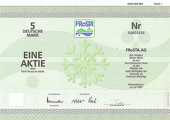 Fondata nel 1905 a Geestemünde come “Hochseefischerei Nordstern AG” per la cattura e lo sfruttamento del pesce di mare. Della flotta di 12 piroscafi, solo 3 navi rimasero dopo la seconda guerra mondiale. Nel 1985 co-fondazione dell’Unione tedesca della pesca. Nel 1988 cambio di nome in Nordstern Lebensmittel AG e integrazione delle capacità di congelamento, lavorazione e commercializzazione al di fuori del settore della pesca. Nel 1997 cambio del nome in FRoSTA AG, quotata ancora oggi. Prodotti ittici, ortaggi, frutta e piatti pronti vengono venduti con i marchi propri FRoSTA, Elbtal e TIKO. FRoSTA è il leader di mercato in Germania per i piatti pronti surgelati; l’AG, quotata ancora oggi, ha un fatturato di quasi 1/2 miliardo di euro.