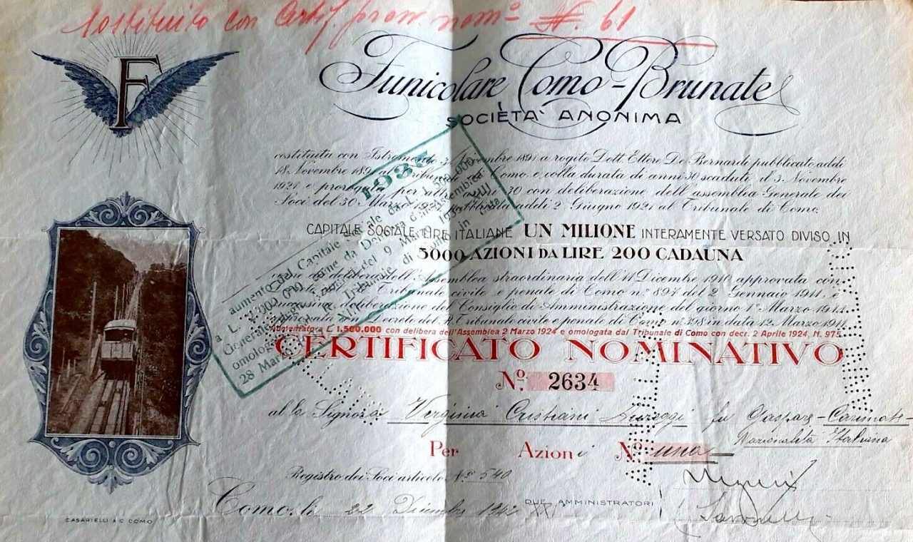 Su iniziativa della popolazione il 3 novembre 1891 venne costituita la Società Anonima per la Funicolare Como-Brunate, con capitale sociale di 350.000 lire versato sotto forma di 1.400 azioni sottoscritte. Il 3 settembre 1892 il consiglio di amministrazione della stessa, presieduto dall’avvocato Carlo Sacchi, approvò il progetto dell’impianto elaborato dai fratelli ingegneri Villoresi e il successivo 4 gennaio si poté dare inizio ai relativi lavori di costruzione.