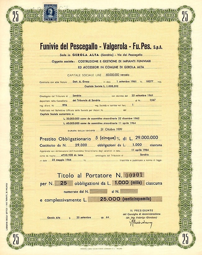 A-45101Funivie del Pescegallo S.p.A. – Valgerola-1Sondrio196425 obbligazioni 5% al portatore da Lire 1.000R1 (Più di 5000 pezzi)S1 (da 0 a 25 €)