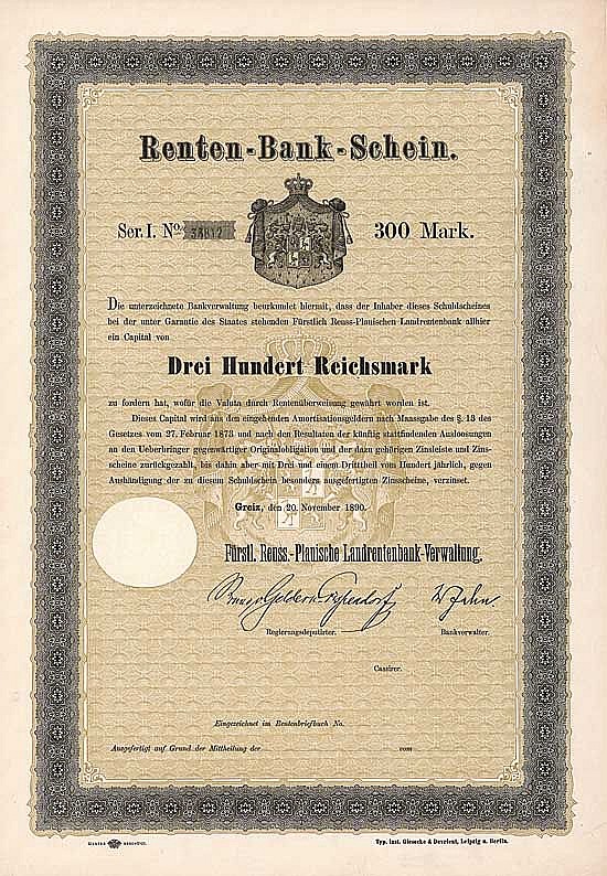 A-66733Fürstl. Reuss.-Plauische Landrentenbank-Verwaltung-1Greiz1890Nota di rendita da 300 Marchi--