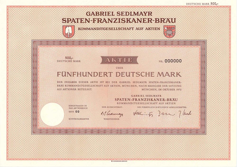 A-65092Gabriel Sedlmayr Spaten-Franziskaner-Bräu-1Monaco19721 azione da 500 MarchiR4 (251-500 pezzi)S4 (da 101 a 250 €)