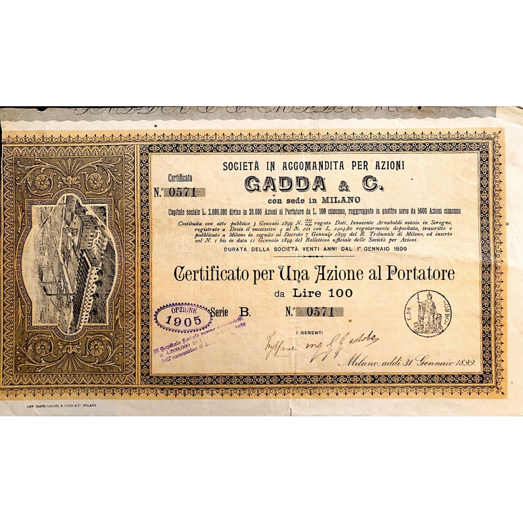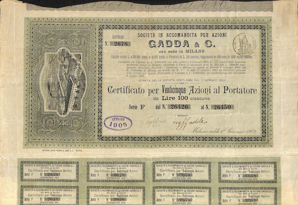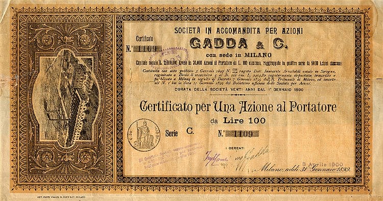 D-6217Gadda & C.-4-Milano19001 azione al portatore di 100 Lire serie CR2 (1001-5000 pezzi)S3 (da 51 a 100 €)