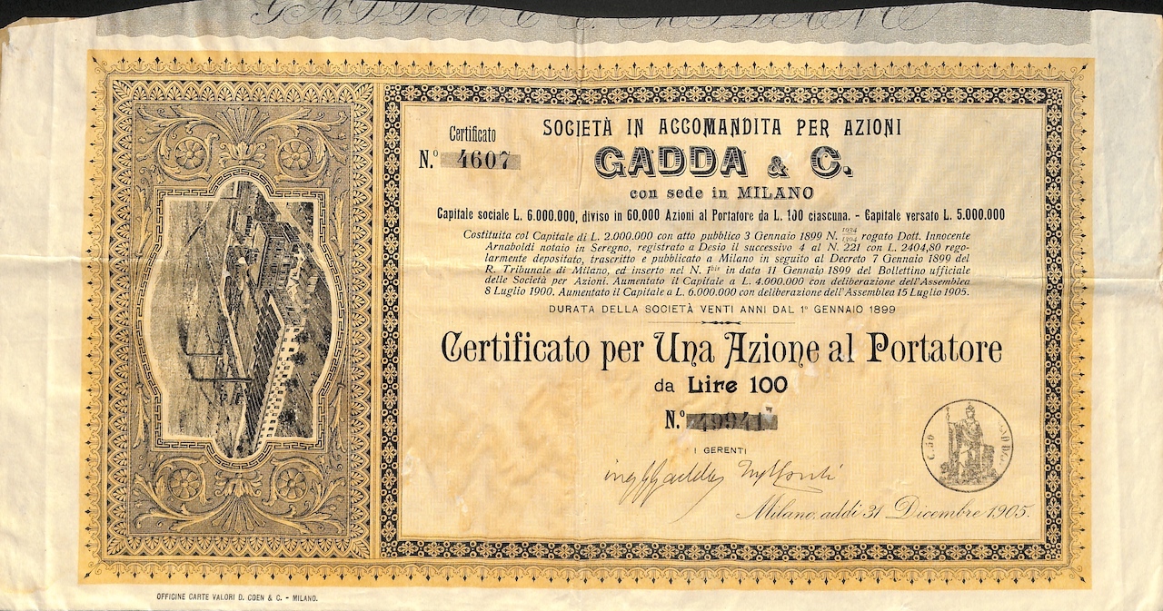 La società fu fondata nel 1899 dall’ingegnere e Senatore del Regno Giuseppe Gadda (1822-1901, firma autografa sul certificato come uno dei gerenti) e altri soci per produrre materiale elettrotecnico. Nel 1901 promosse, in compartecipazione con la Edison, la costituzione della Società Anonima per Imprese Elettriche Conti & C. per la costruzione di impianti elettrici e relativi servizi. Il primo fu quello che sfruttava le acque del Brembo per fornire servizi nella zona di Monza, seguì l’impianto idroelettrico di Cerano-Trecate. Nel 1908 la Gadda & C. fu rilevata da Tecnomasio Brown Boveri.