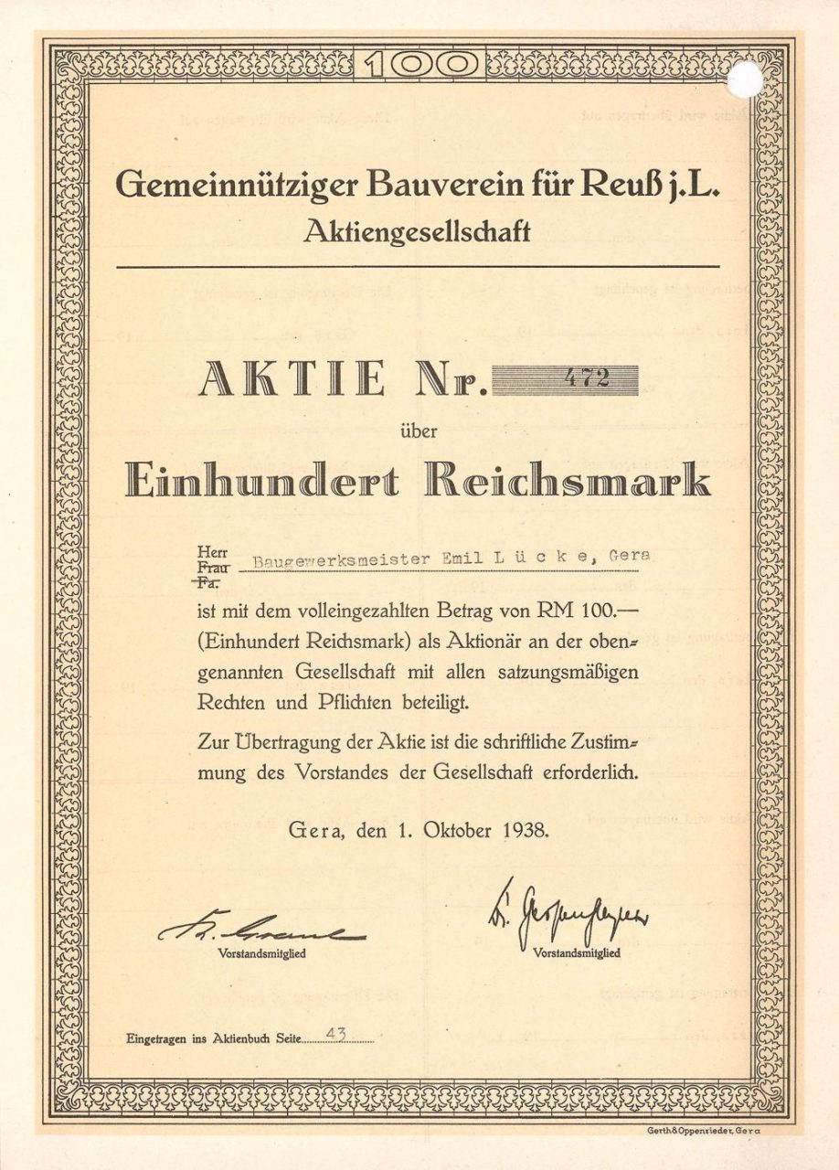 Fondata nel 1911 per implementare l’insediamento “Heinrichsgrün”, la prima città giardino della Turingia, decisa dal consiglio comunale di Gera. Nel 1929, 186 case erano state costruite nel piccolo insediamento tra Weißer Elster e la foresta di Hainberg, ed è ancora considerato uno dei luoghi più belli della città. Seguirono 116 case nell’insediamento di Tinz e 110 case nell’insediamento di Lusan. Nel 1940 cambiò il nome in “Associazione per l’edilizia senza scopo di lucro Gera AG”.