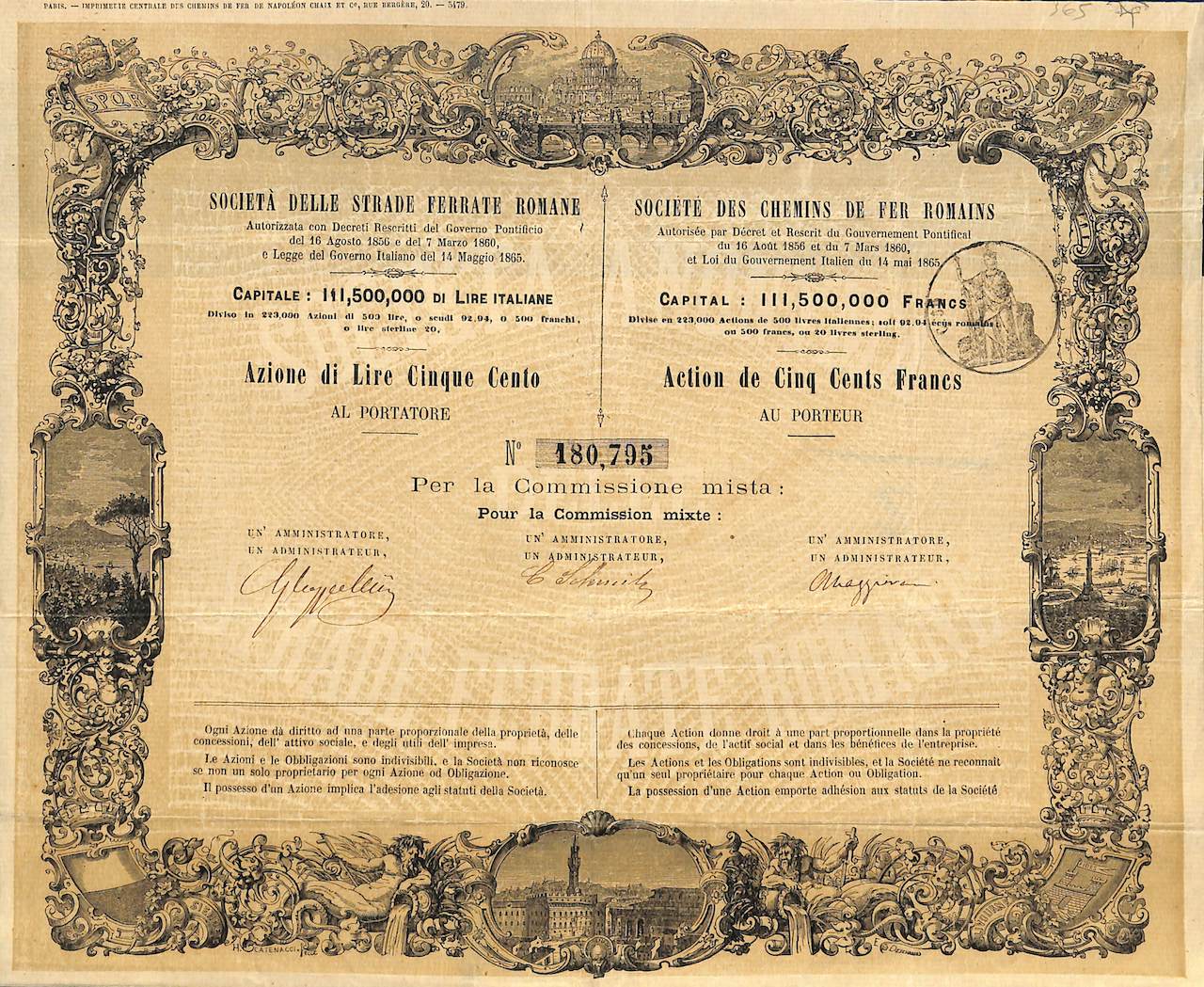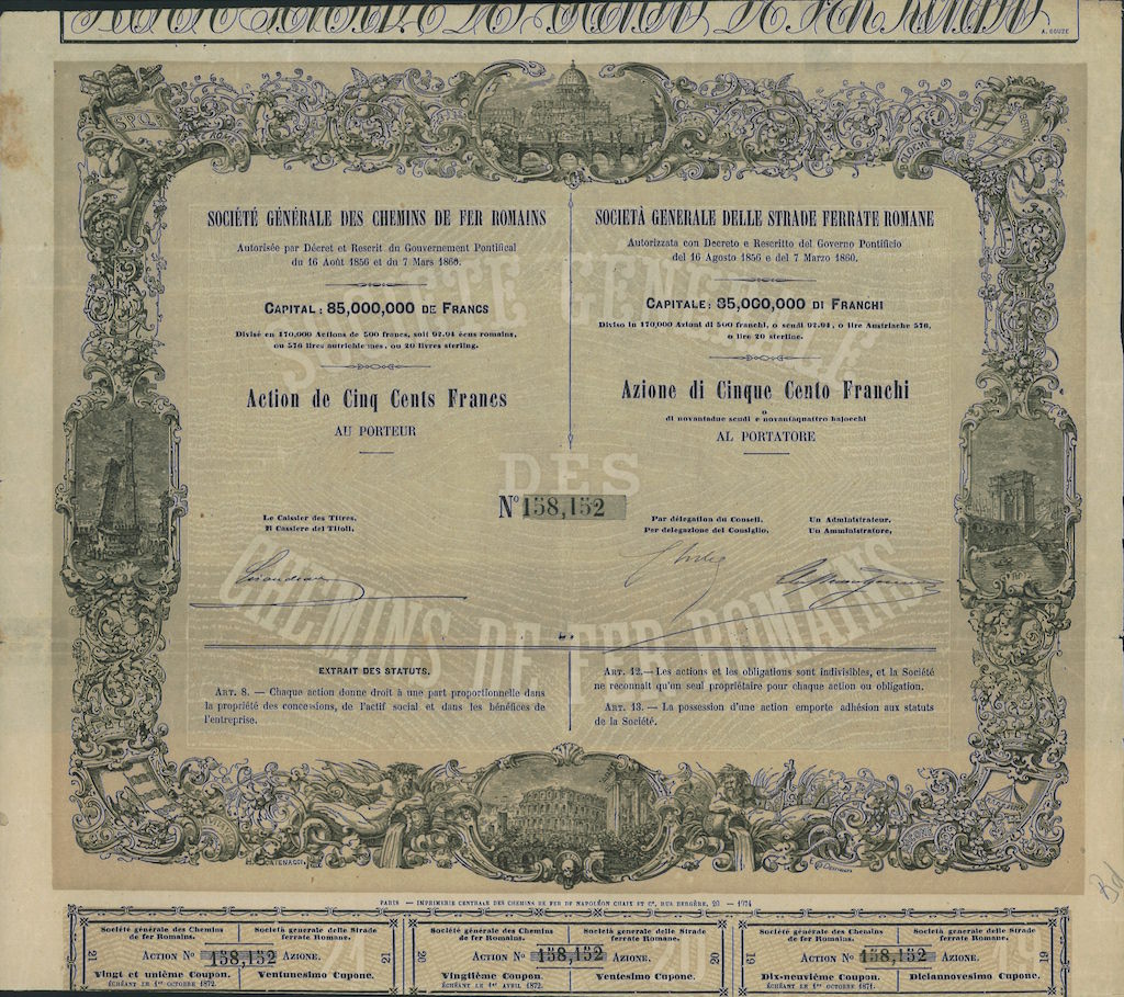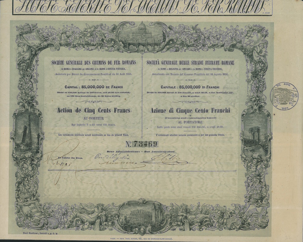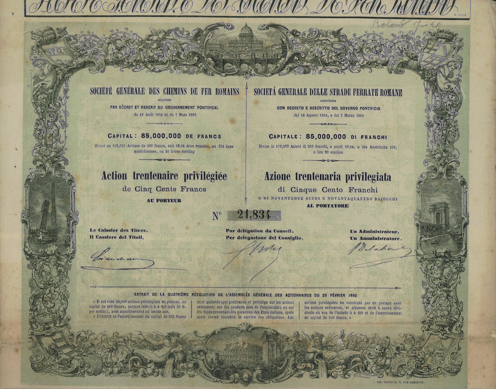 I-1077---Roma18621 azione privilegiata da 500 Franchi francesiR3 (501-1000 pezzi)S4 (da 101 a 250 €)