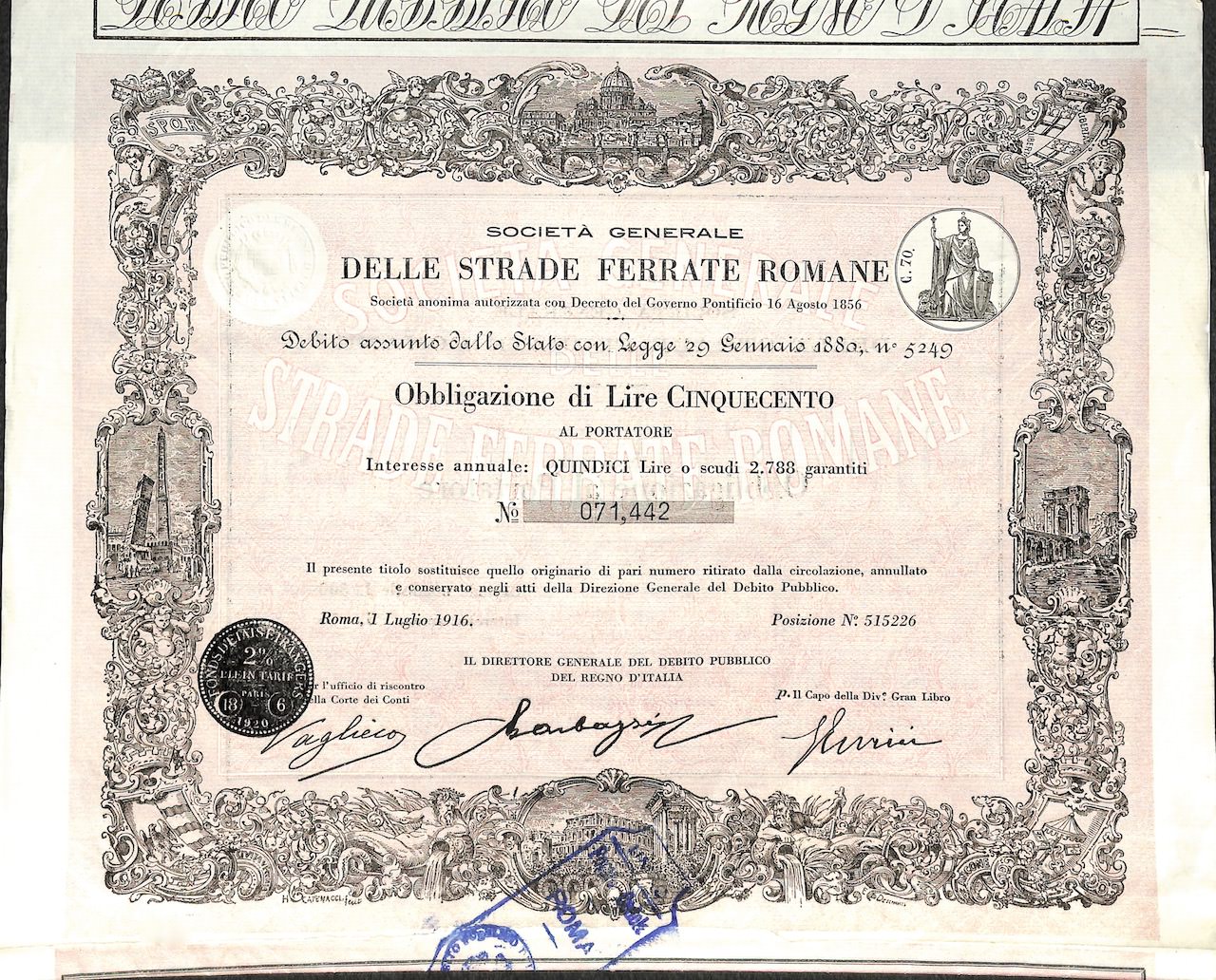 K-1077Strade Ferrate Romane Soc. Generale delle-9N.D.Catenacci H.Roma19161 obbligazione 3% da Lire 500R3 (501-1000 pezzi)S3 (da 51 a 100 €)