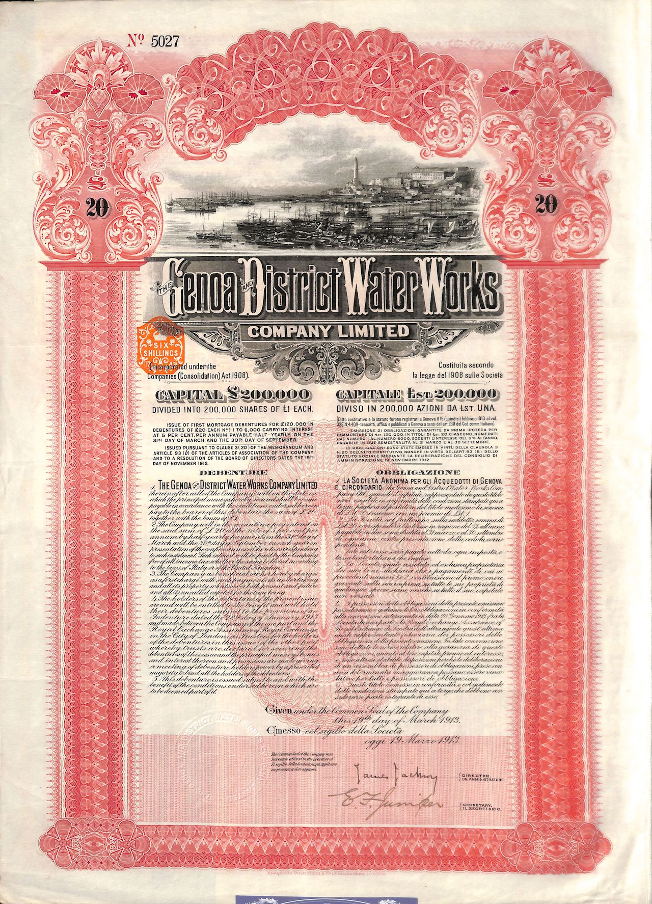 A-10901Genoa District Water Works-1Bradburry, Wilkinson & C. Printers, LondonGenova19131 obbligazioneR4 (251-500 pezzi)S4 (da 101 a 250 €)