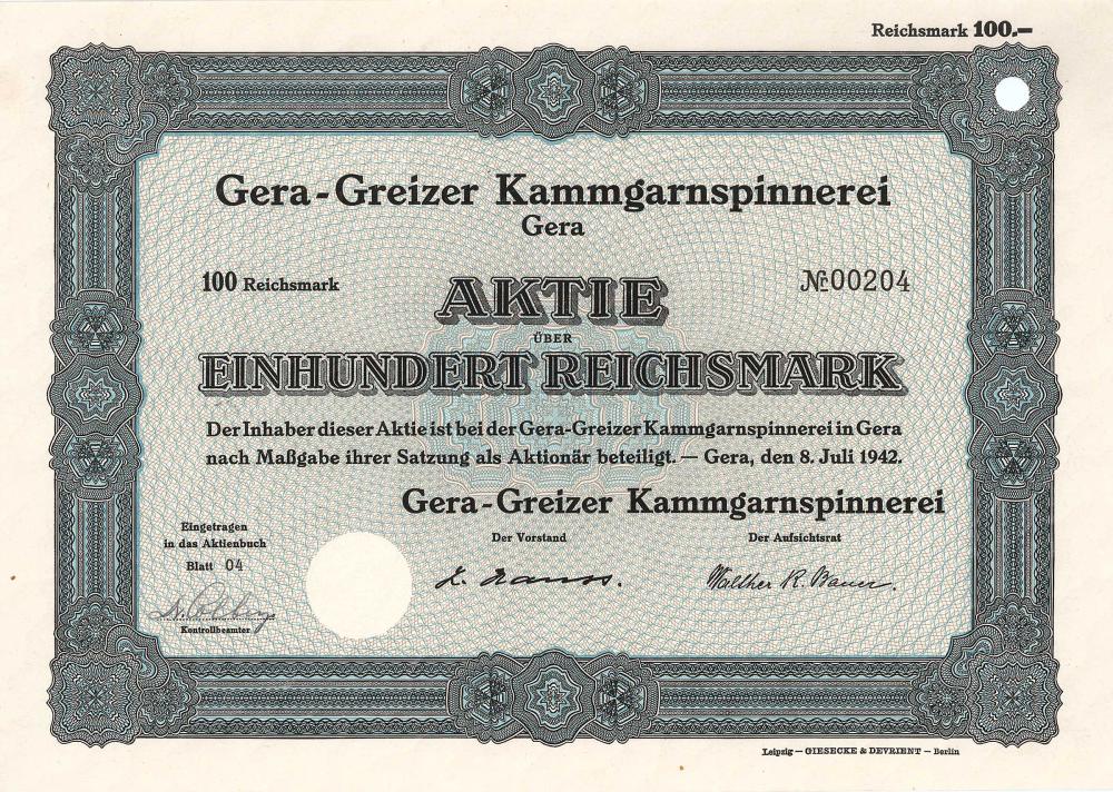Fondata nel 1890. A quel tempo a Gera c’erano già più di 60 aziende tessili. La filatura pettinata di Gera-Zwötzen si è sviluppata negli anni ’30 fino a diventare una delle più grandi filature di tutta la Turingia. Oltre ai filati di pura lana, successivamente sono stati prodotti anche filati di pura cellulosa e misti di cellulosa. Nel 1949 era di proprietà pubblica come “VEB Kammgarnspinnerei Gera” e nel 1970 fu incorporata nella filatura pettinata VEB Zwickau come Plant III. Quotazione in borsa: Freiverkehr Lipsia, nel dopoguerra poi nel traffico telefonico di Berlino. La stessa AG trasferì la sua sede da Gera ad Amburgo nel 1959, nel 1961 il capitale fu convertito 50: 1 da RM a DM, e alla fine del 1962 l’AG andò in liquidazione.