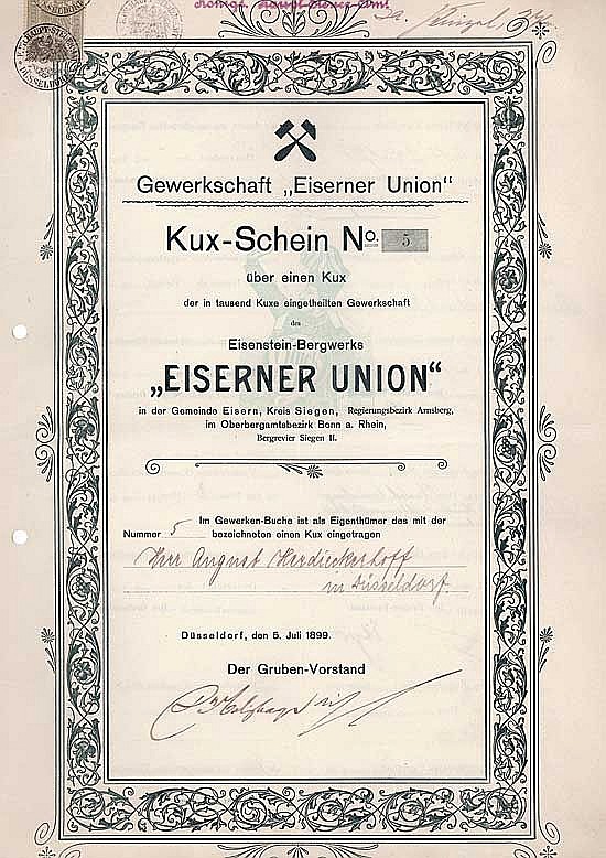 La fossa si trovava sul versante occidentale dell’Eisernhardt nell’alta valle di Hengsbach. Nel 1801 fu creato il tunnel dell’Unione per rimuovere l’acqua dalle fosse di Friedensburg, Harteborn, Abendstern e Hinterste Sinternzeche. Durante la guida di questo tunnel, fu trovata pietra di ferro marrone e nel 1869 il minerale fu estratto dal tunnel più in alto rispetto a qualsiasi altra miniera nell’area dell’Unione. Nel 1887 le rimanenti miniere nell’area del sindacato si consolidarono nella “Unione del ferro”, che dal 1883 aveva già un collegamento con la ferrovia Eisern-Siegen vicino all’Eiserner Hütte attraverso il tunnel Morgenröther. Nel 1899 associazione con la vicina miniera di Glücksbrunnen. Nel 1916 l’estrazione mineraria tedesco-lussemburghese e Hütten-AG (Dept. Dortmunder Union) rilevarono la miniera con una forza lavoro di quasi 100 persone, che nel 1925 fu sorprendentemente chiusa.