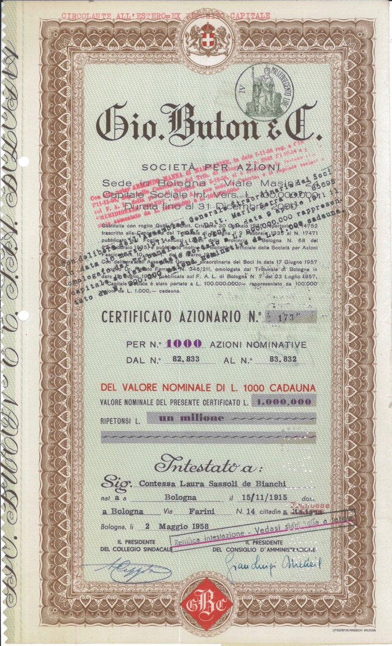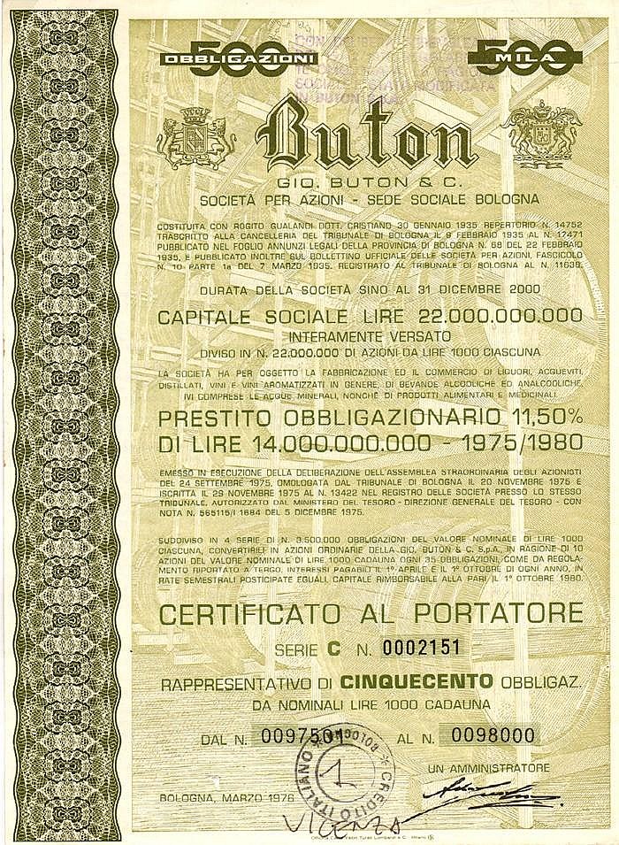 L’origine della celebre distilleria risale al 1860 in Francia quando Jean Bouton riforniva Napoleone Bonaparte con i suoi liquori. Caduto l’imperatore, Bouton ormai ridotto in miseria decise di trasferirsi a Bologna, italianizzando il nome in Giovanni Buton. Il suo primo liquore “italiano” fu il Coca – Buton, derivato dalla distillazione delle foglie di coca boliviana: ebbe un iniziale grande successo per le sue ipotetiche proprietà salutari.