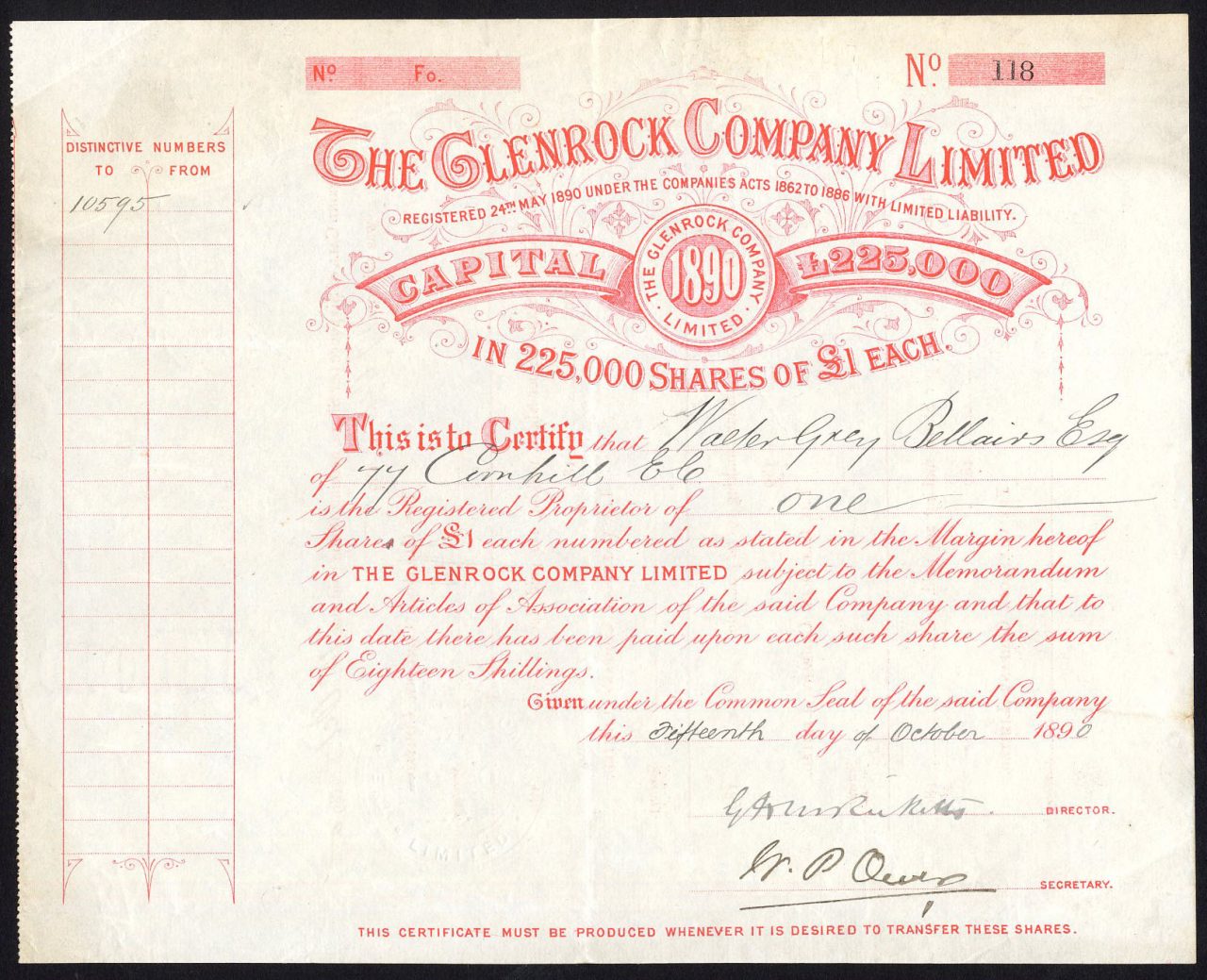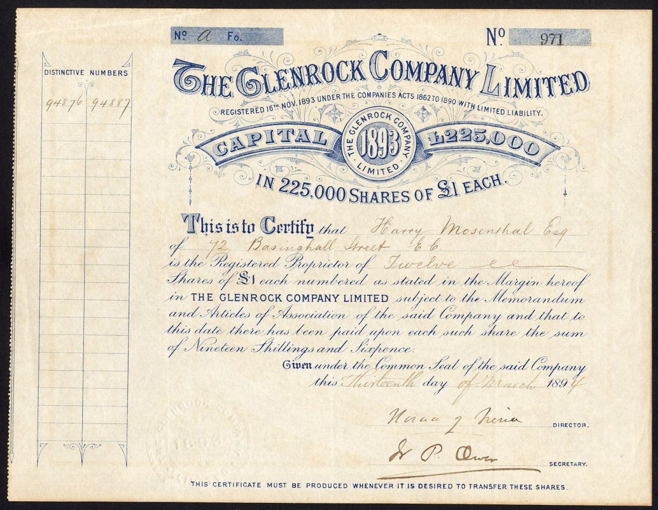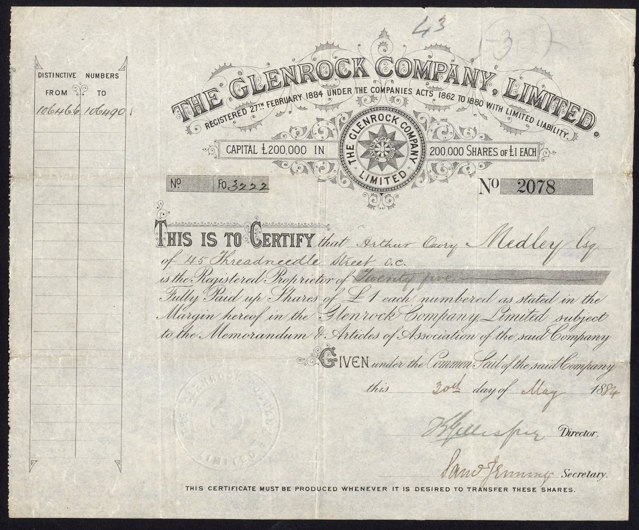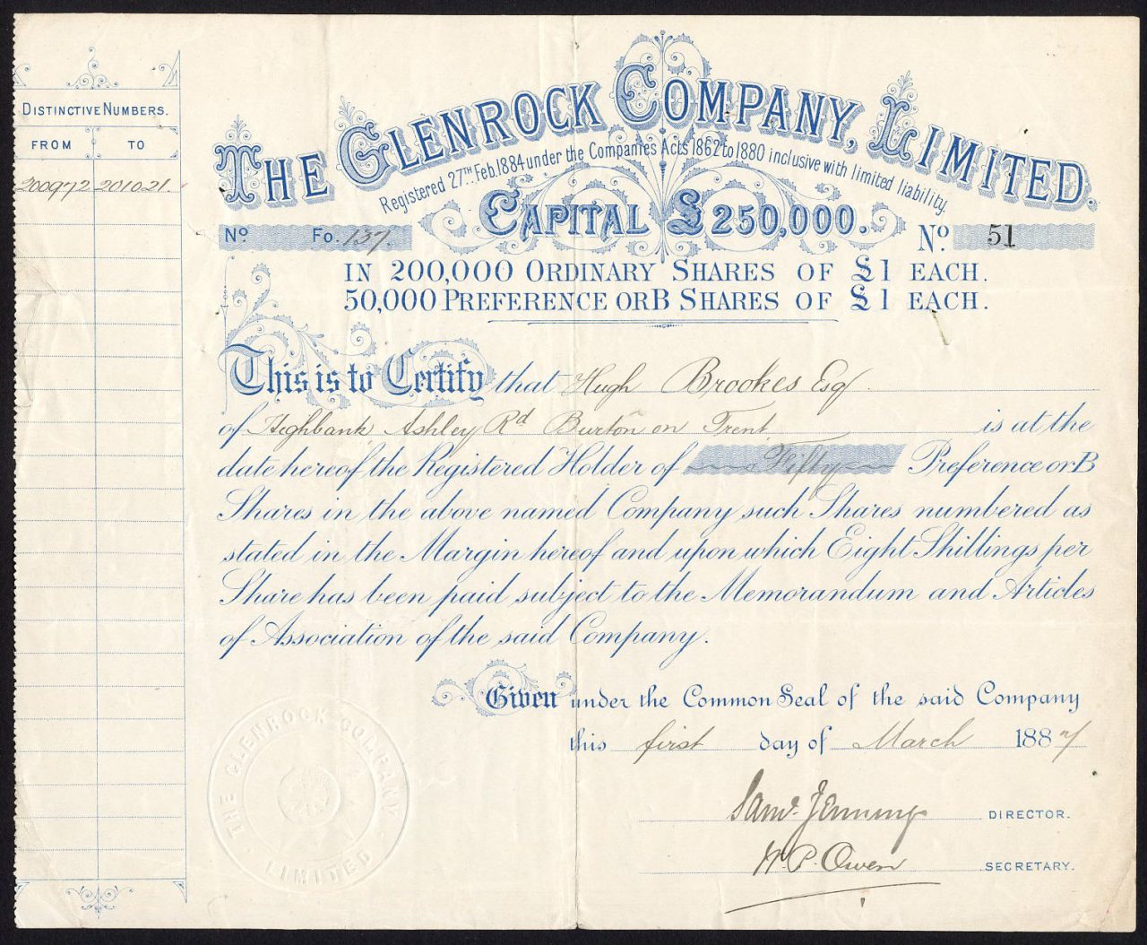 Registrata il 27 febbraio 1884. Ricostruita come società con lo stesso nome nel 1890 e di nuovo nel 1893 (vedi altre voci). Numero di società 19493