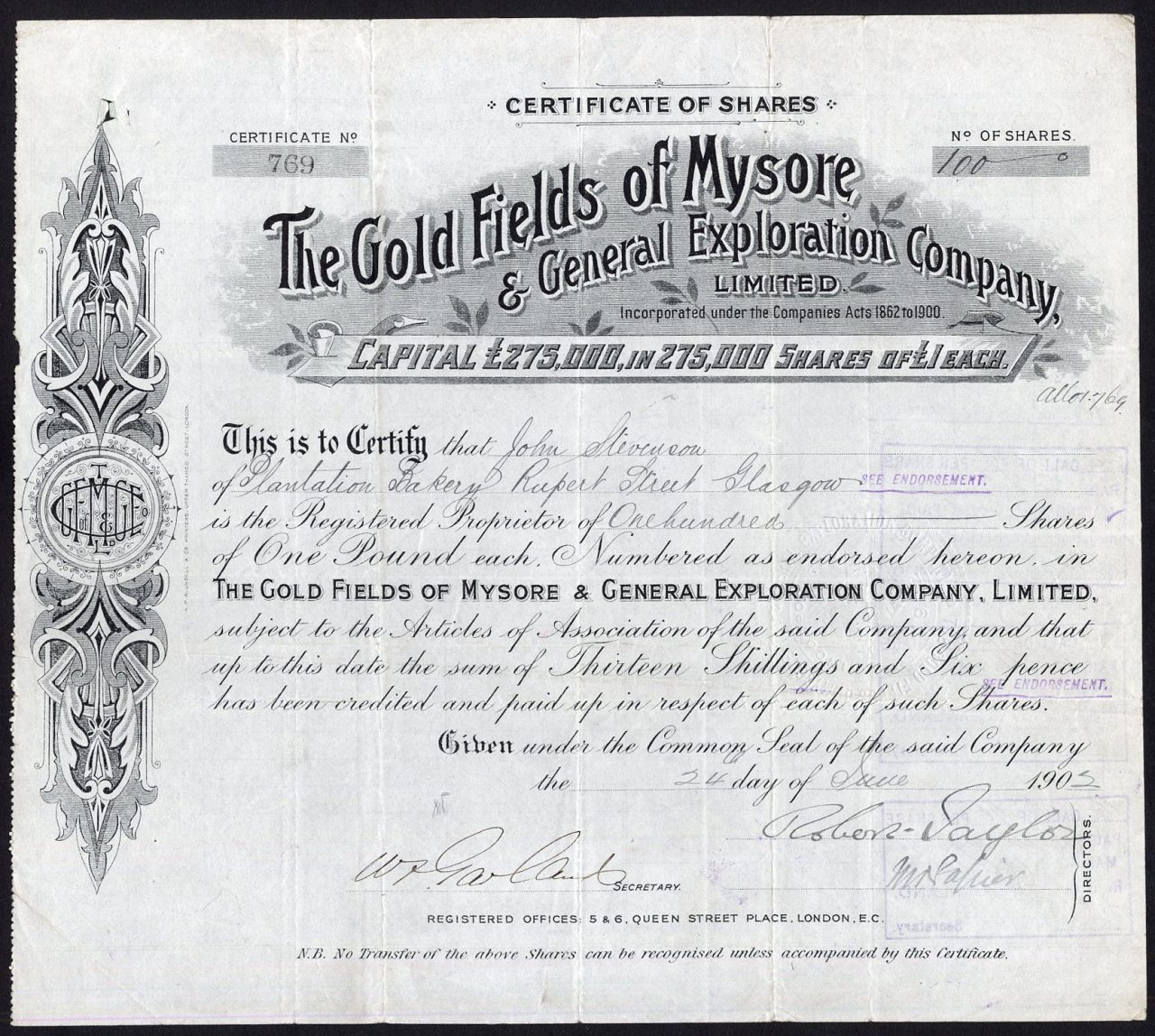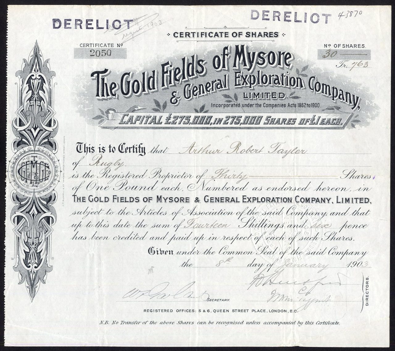 Registrato nel 1902 come ricostruzione di Gold Fields of Mysore Ltd. Dissolto <1916. Numero società 73249