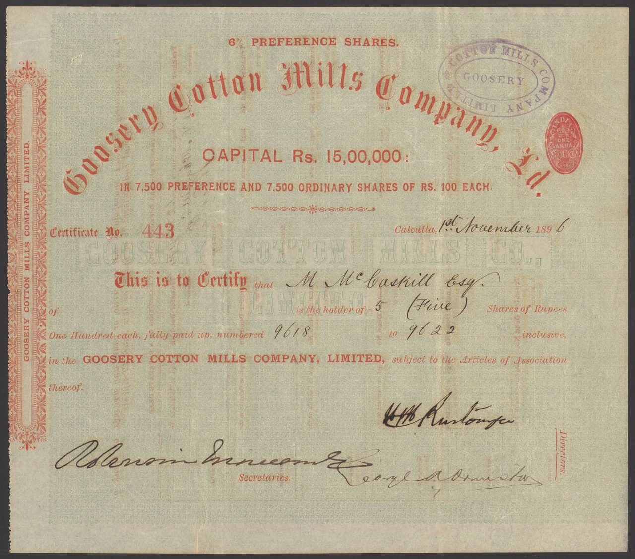 B-41285Goosery Cotton Mills Company Limited-2British India1896preferences sharesR1 (Più di 5000 pezzi)S1 (da 0 a 25 €)