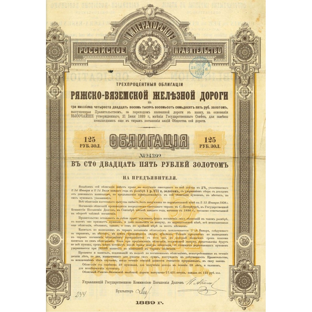 A-60733Gouvernement imperial de russie – chemin de fer de riajsk-viasma-1 Russia1889125 RublesR2 (1001-5000 pezzi)S2 (da 26 a 50 €)