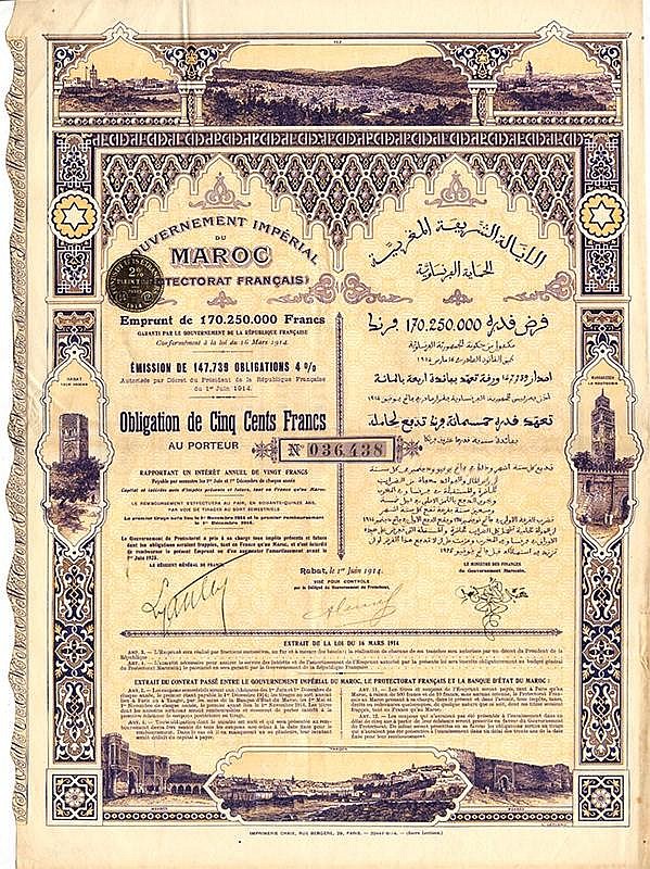 Suggestiva e fiabesca grafica ispirata allo stile moresco con pittoresche vedute delle principali città marocchine; in particolare risalto la Torre di Hassan a Rabat che rappresenta il minareto di una moschea rimasta incompleta e la Moschea della Kutubiyya, il principale edificio religioso di Marrakesh. Con il Trattato di Fez del 30 marzo 1912 il Marocco fu dichiarato Protettorato francese, con capitale a Rabat, dove risiedeva il Sultano.