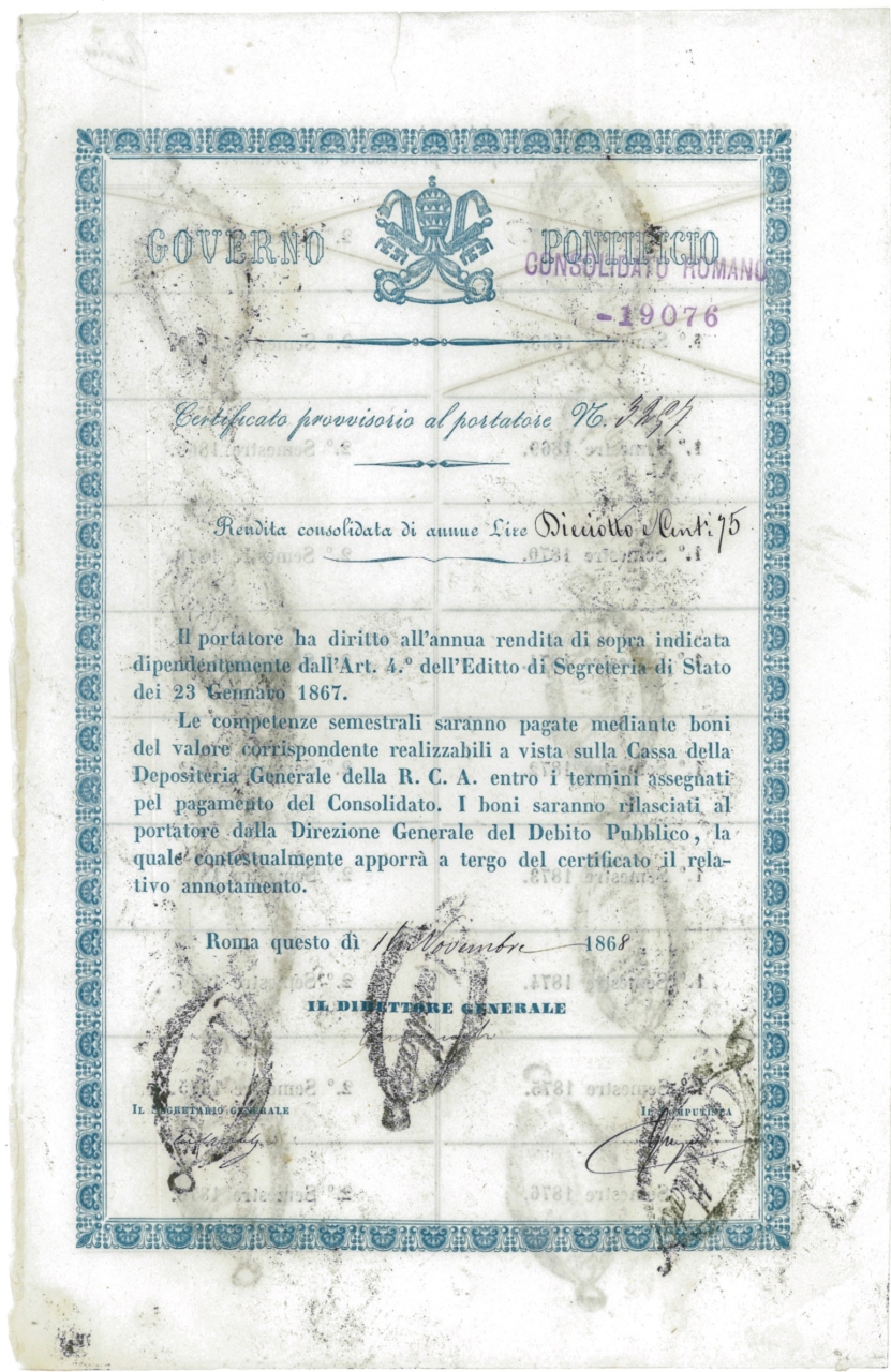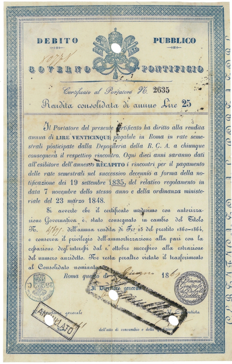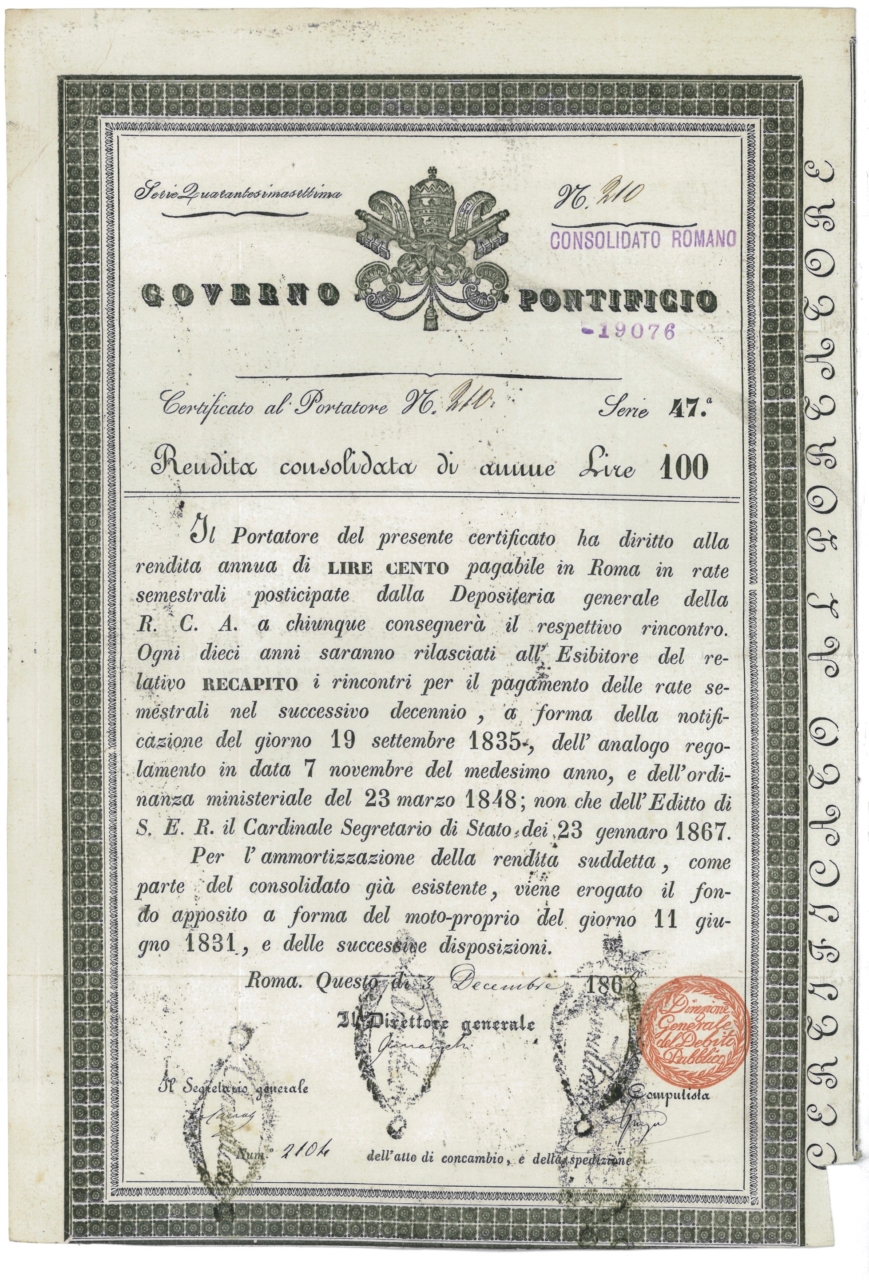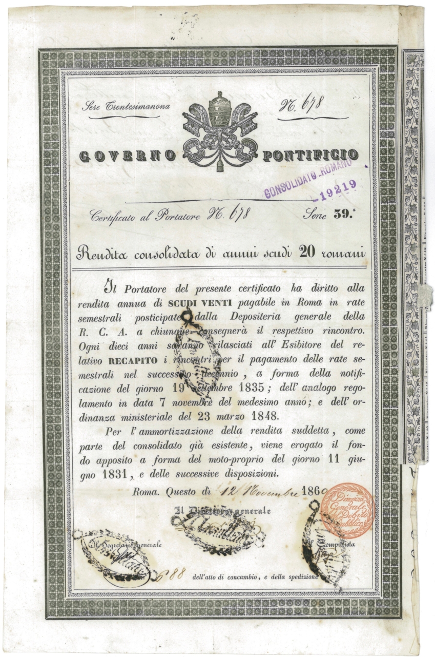 Governo Pontificio – Consolid. Romano – Cert. al Portatore