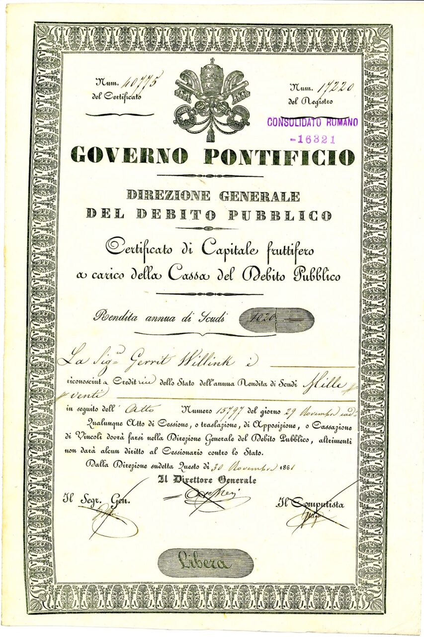 Governo Pontificio – Consolidato Romano – Dir. Gen. del Debito Pubblico