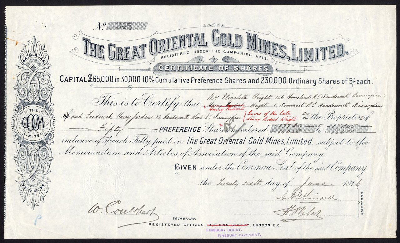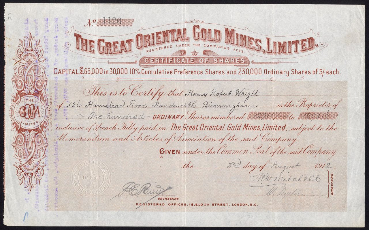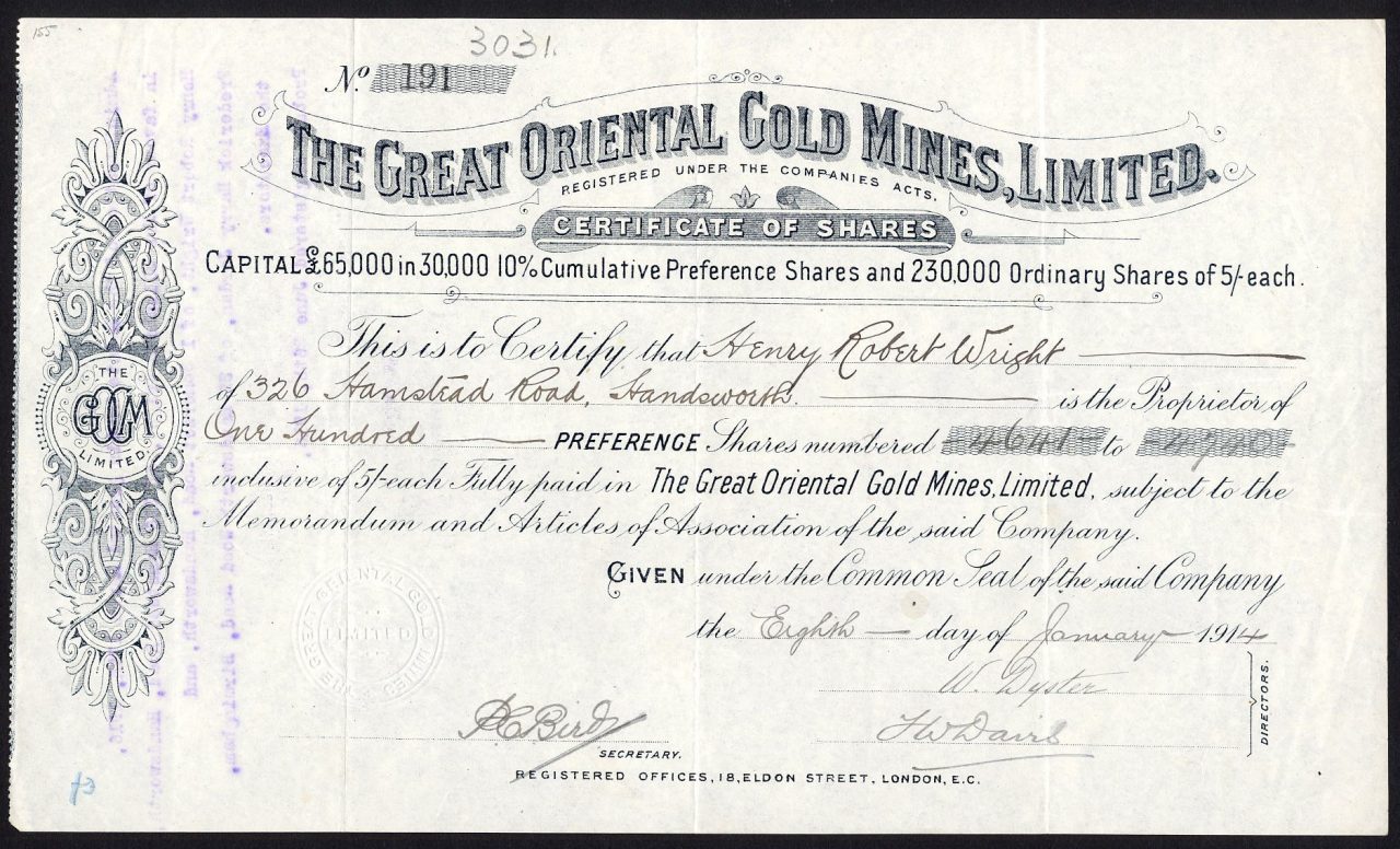 Registrato il 7 gennaio 1908 per acquisire contratti di locazione di miniere d’oro situate a Wandiligong, Bright, Victoria, Australia. Liquidazione volontaria 8 marzo 1917. Numero della società 96359