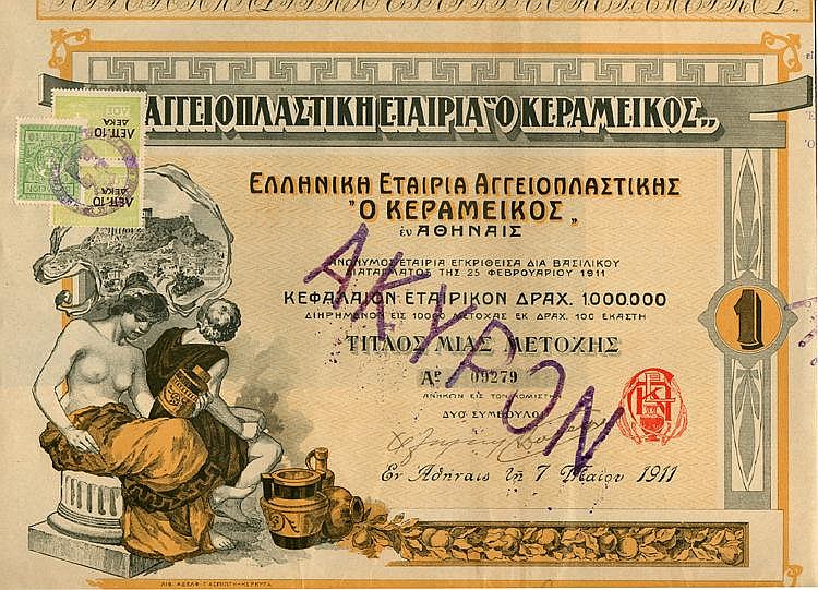 A-55993Greca di Fabbricazione La Ceramica Società-1Atene19111 azione al portatore da 100 Dracme--