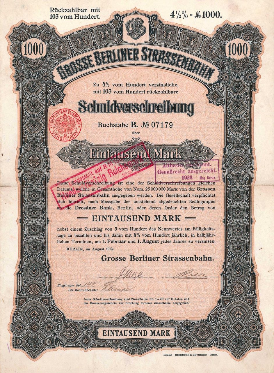 A-61071Grosse Berliner Strassenbahn-1Berlino19131 obbligazione 4,5% da 1.000 MarchiR4 (251-500 pezzi)S4 (da 101 a 250 €)