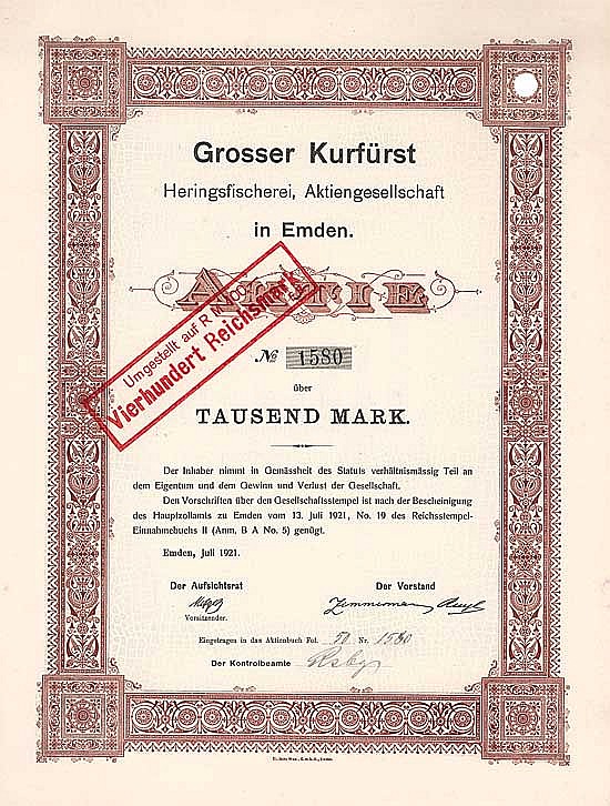 B-63782Grosser Kurfürst Heringsfischerei AG in Emden-2Emden19211 azione da 1.000 MarchiR4 (251-500 pezzi)S4 (da 101 a 250 €)