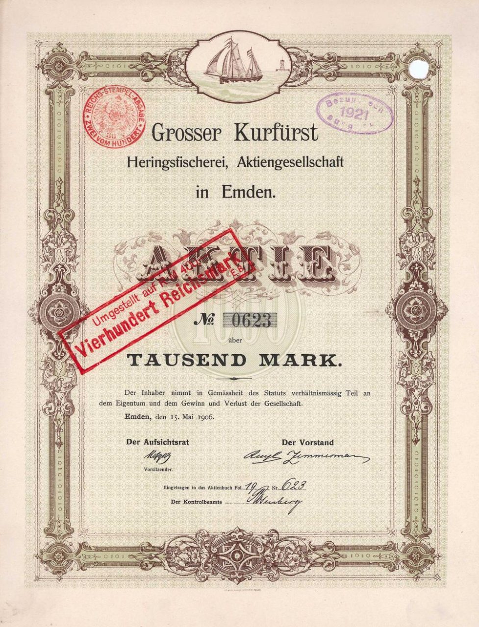 A-63782Grosser Kurfürst Heringsfischerei AG in Emden-1Emden19061 azione da 1.000 MarchiR4 (251-500 pezzi)S4 (da 101 a 250 €)