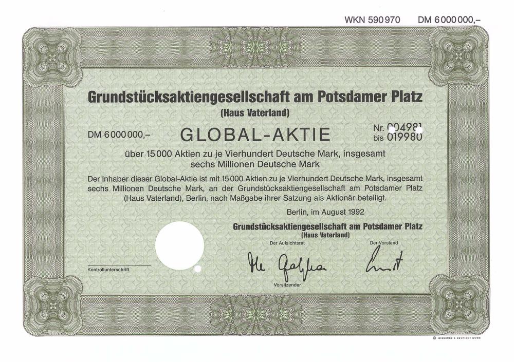 Fondata nel 1909 come società di costruzioni su Potsdamer Platz, ribattezzata Bank for Real Estate and Trading Ltd nel 1911 e poi come sopra nel 1937. Gestione della proprietà appartenente all’azienda, in cui lavorò la Universum-Film AG con i “giochi di luce da camera”. Per decenni dopo la guerra, fu solo un’inutile proprietà in rovina. Dopo la riunificazione, tuttavia, divenne il soggetto della più calda speculazione: per poter realizzare i suoi piani di costruzione a Potsdamer Platz, lo sviluppatore di Heidelberg Roland Ernst, che in seguito fallì, ebbe bisogno esattamente di quest’area e dovette riattivare la vecchia società per ottenere il controllo. Per fare ciò, acquistò le vecchie azioni Reichsmark e pagò fino a 48.000 DM per azione – per azioni che in precedenza avevano portato poco più di 50 DM sul mercato.