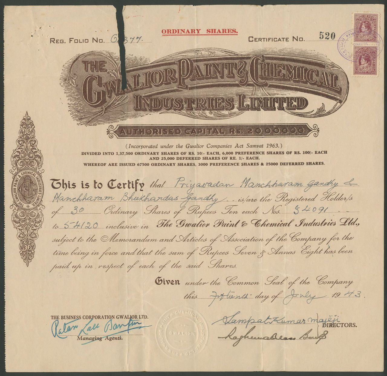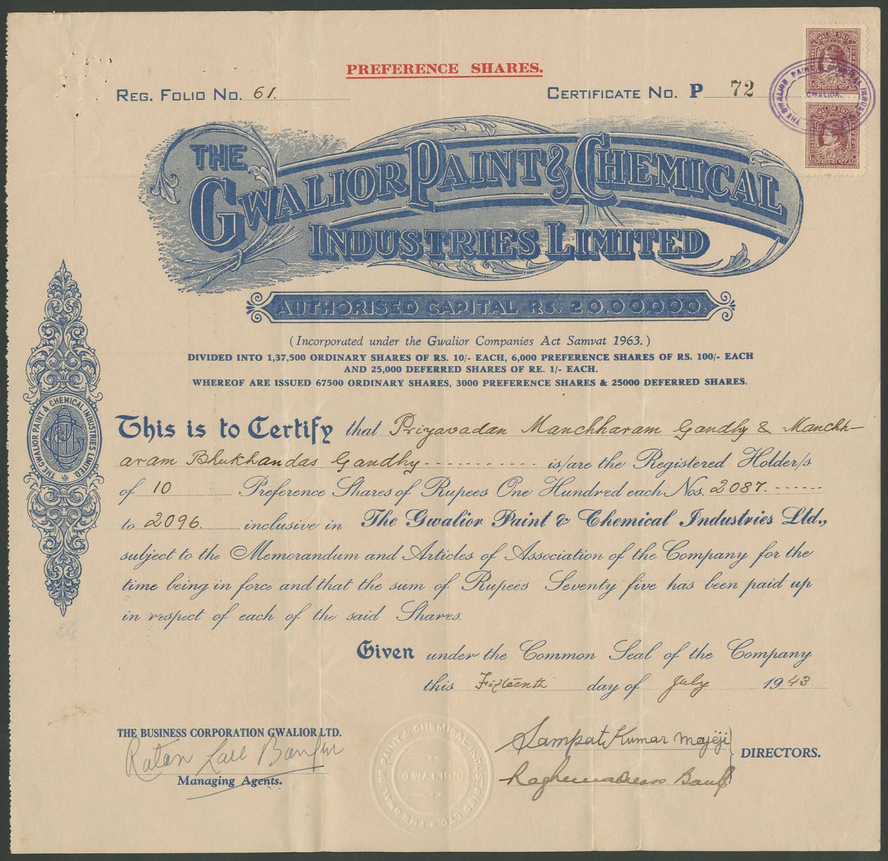 Incorporato ai sensi del Gwalior Companies Act di Samvar 1963 (1906). Capitale 20.00.000 rupie in azioni ordinarie di 10 rupie, azioni privilegiate di 100 rupie e azioni differite di 1 rupia. (1943)
