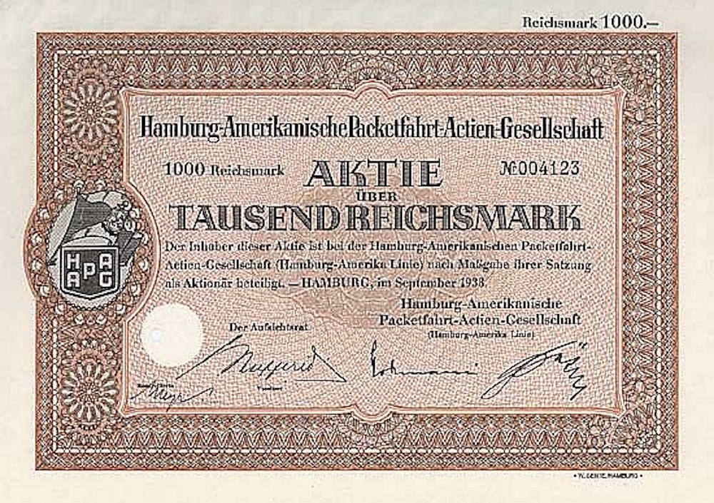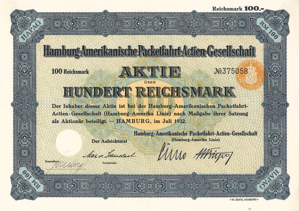 Fondata nel 1847. Tre grandi velieri furono i primi veicoli della linea Amburgo-America, ma furono presto sostituiti da navi a vapore. Alla fine del 19 ° secolo, la flotta era cresciuta fino a oltre 40 piroscafi. Le linee erano gestite da Amburgo a New York, Baltimora, Filadelfia, Boston, Canada, New Orleans, da Stettin a New York e dall’Italia a New York e in Argentina. I contratti assicurarono che HAPAG trasportasse posta tedesca, inglese, francese, americana e italiana attraverso l’Atlantico. Fino al 1870 era solo di importanza regionale, ma sotto Albert Ballin (1857-1918), che divenne Direttore Generale di HAPAG nel 1899, fu creata una società di importanza globale. Raggiunse il suo massimo splendore nel 1914 con una flotta di 1.360.000 tonnellate lorde di registro, tra cui i piroscafi “Imperator”, “Vaterland” e “Bismarck”, le navi più grandi del mondo. Le conseguenze della prima guerra mondiale significarono una svolta importante: a causa del trattato di Versailles, l’intera flotta doveva essere consegnata ai paesi dell’Intesa. La ricostruzione fu ardua, e fu solo quando le linee Deutsch-Austral, Kosmos e Hugo-Stinnes furono rilevate nel 1926 che HAPAG riprese il suo posto tra le più grandi compagnie di navigazione del mondo. Nel 1930 fu raggiunto un accordo congiunto con il concorrente del minerale di Brema, Norddeutscher Lloyd, e HAPAG era il principale rappresentante della Deutsche Zeppelin-Reederei e agente generale della “Deutsche Lufthansa AG”. Nel 1970 fusione di HAPAG e Norddeutscher Lloyd, fondata nel 1857, nell’odierna Hapag-Lloyd AG. Ora è una filiale dell’ex Preussag (ora TUI), attiva nei settori della navigazione marittima, dei trasporti, delle operazioni portuali, delle agenzie di viaggio, dei viaggi aerei. È stato solo nel 2005 che questa divisione TUI è stata nuovamente rafforzata in modo significativo acquistando le CP-Ships (divisione marittima della Canadian Pacific Railway).