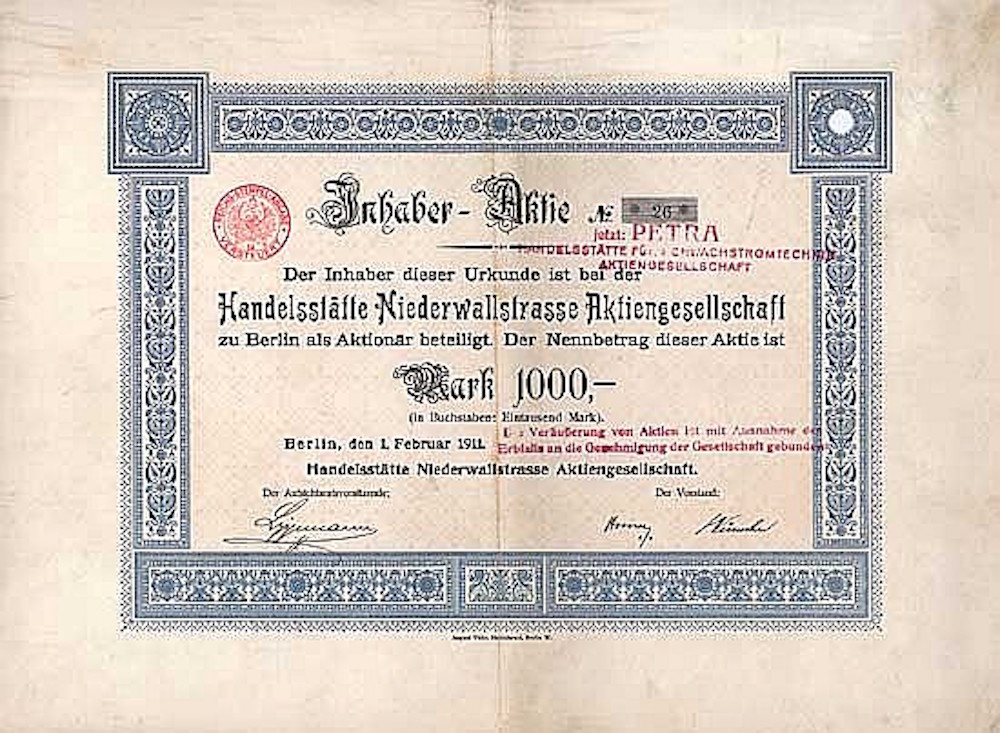 Fondata nel 1910 da Immobilien-Verwertungs- und Hypotheken-Verkehrs-GmbH allo scopo di acquisire e gestire le proprietà in Niederwallstrasse 18, 19 e 20. Lo scopo originario della gestione delle proprietà commerciali subì un profondo cambiamento nel 1919: prima ribattezzato “PETRA Handelsstätte für Schwachstromtechnik AG”, poi poche settimane dopo in “Petra AG für Elektromechanik”. Ora venivano prodotte attrezzature cinotecniche. Soppresso d’ufficio nel 1928.