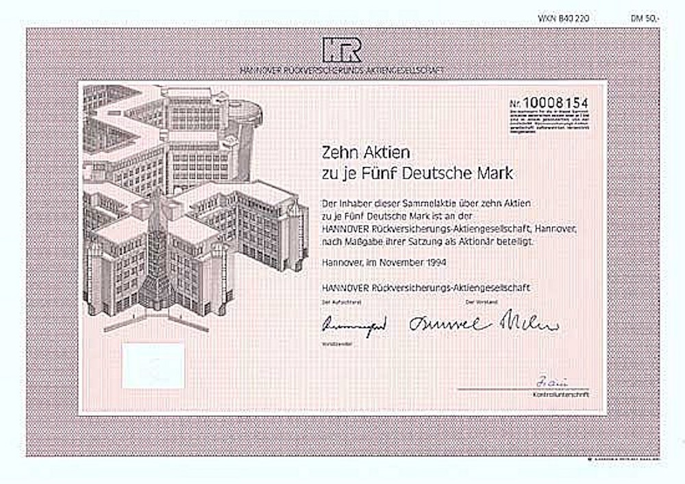 A-67046Hannover Rückversicherungs-AG-1Hannover199410 azioni da 5 Marchi--
