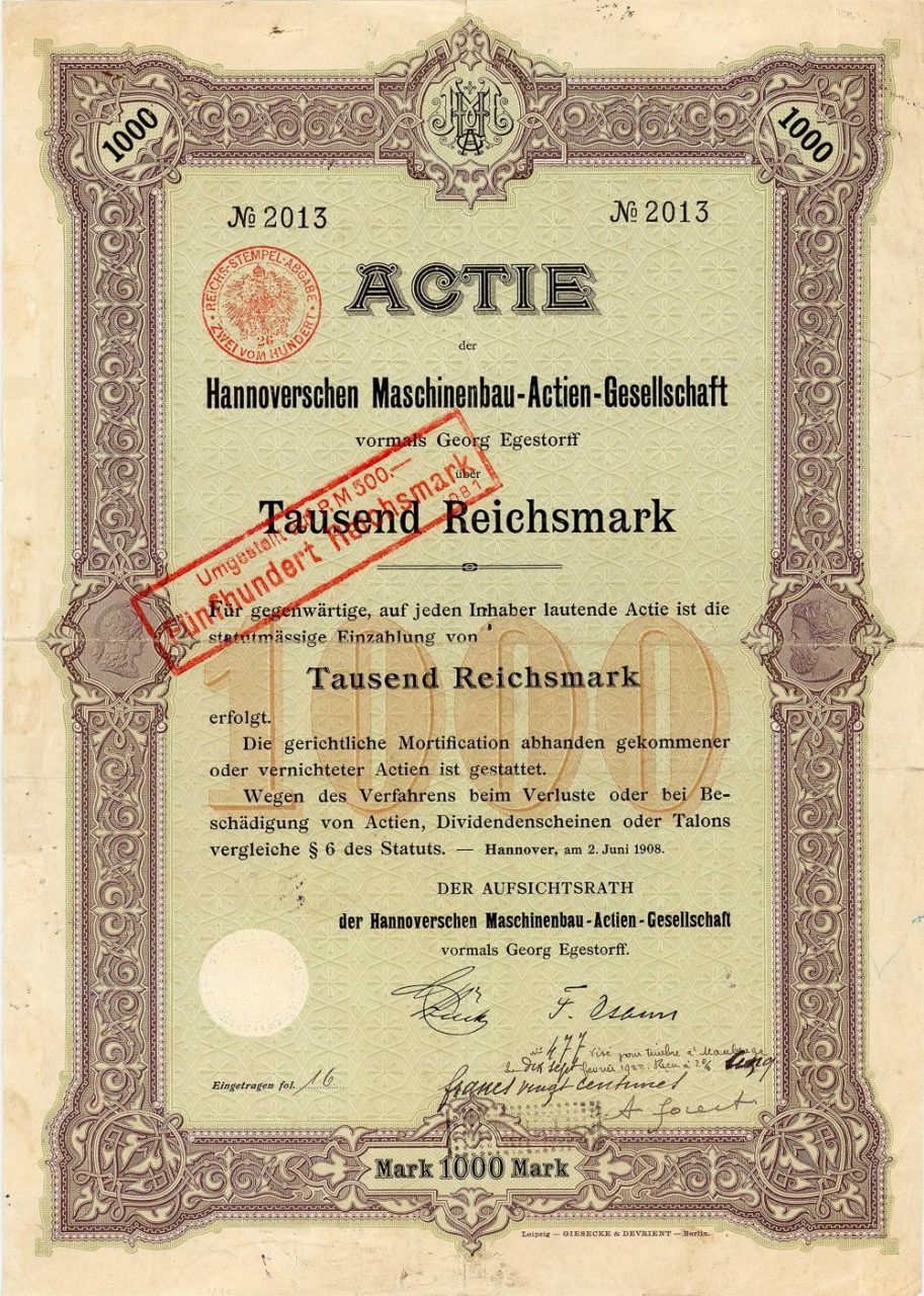 A-62183Hannoversche Maschinenbau-AG vormals Georg Egestorff-1Hannover19081 azione da 1.000 MarchiR7 (26-50 pezzi)S7 (da 1.001 a 1.500 €)