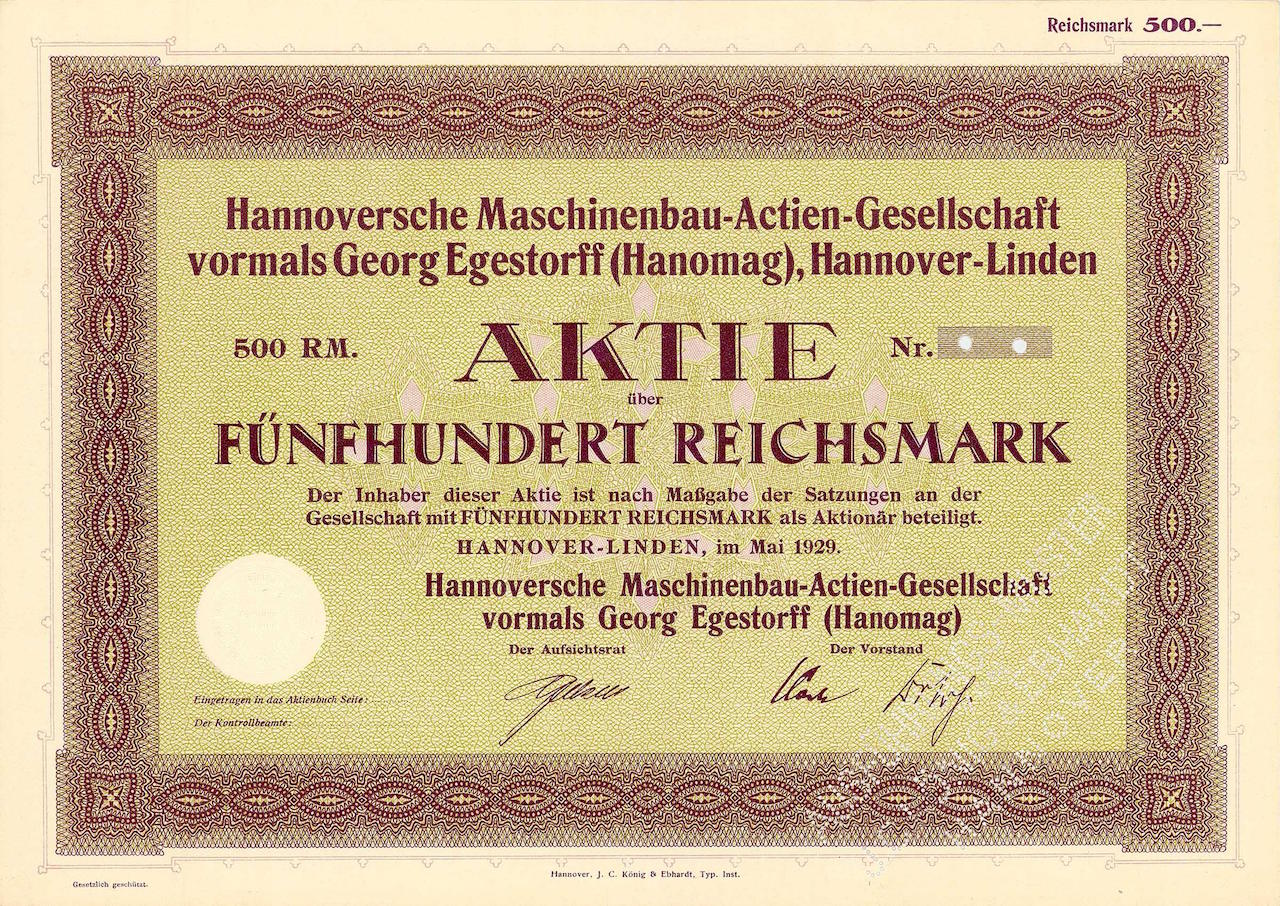 B-62183Hannoversche Maschinenbau-AG vormals Georg Egestorff-2Hannover19291 azione da 500 MarchiR5 (101-250 pezzi)S5 (da 251 a 500 €)
