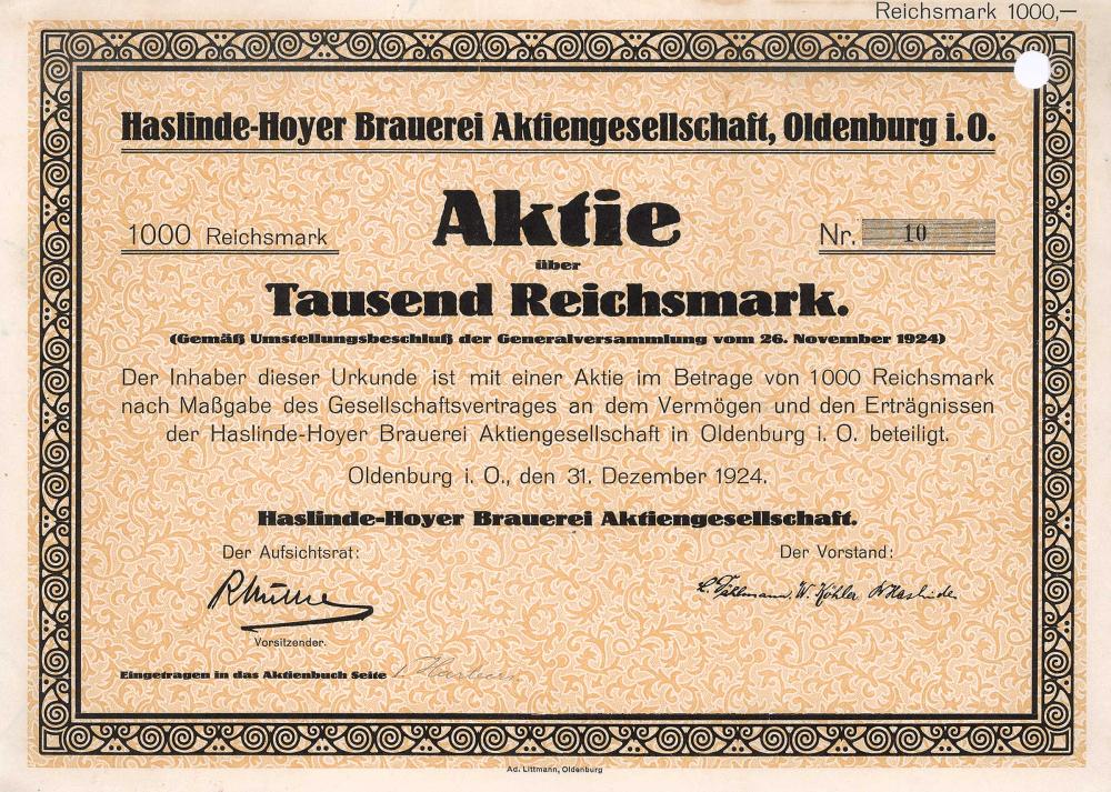 Fondata nel 1922. Il birrificio era costituito dall’ex birrificio AG Hoyers, Oldenburg e dal birrificio privato B. Haslinde (fondato nel 1876), Ohmstede. Trasformata in una GmbH negli anni ’60 e venduta al birrificio Haake Beck nel 1971. Ha servito come centro di distribuzione fino al 1976, quando è stato demolito, compresa la Villa Haslinde.