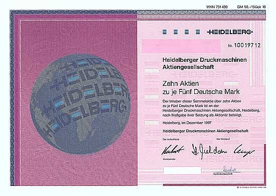 La fabbrica di macchine è stata fondata nel 1850 da Andreas Hamm, AG dal 1899 come “Schnellpressenfabrik A. Hamm AG”, ribattezzata “Heidelberger Druckmaschinen AG” nel 1967. Con la “Heidelberger Tiegel”, la prima macchina da stampa rotocalco completamente automatica al mondo, così come le macchine automatiche a cilindro e le macchine da stampa a foglio per la stampa offset, l’azienda è cresciuta fino a diventare il più importante (e a volte più redditizio) produttore di macchine da stampa al mondo. Nel 1998 fusione con Linotype Hell AG, che in precedenza apparteneva al gruppo Siemens, che ha poi raggiunto una posizione di rilievo anche nella prestampa. Il principale azionista fino all’inizio del 2004 era il gruppo RWE (precedentemente attraverso la controllata Rheinelektra, Mannheim).