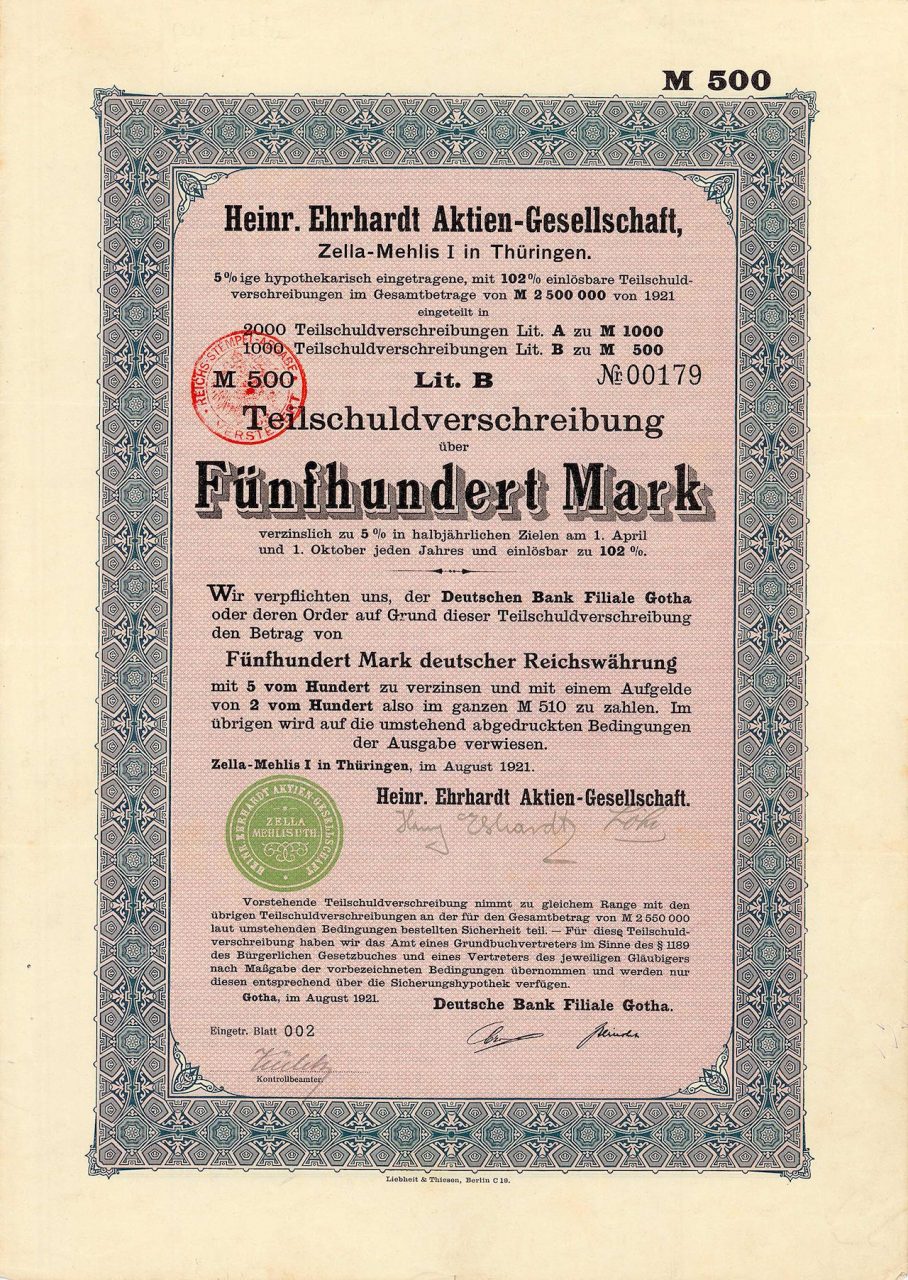 Heinrich Ehrhardt (1840-1928) fu un importante inventore, imprenditore e manager tedesco. Ha registrato 128 brevetti nel Reich tedesco. Tra le altre cose, nel 1878 fondò una fabbrica di armi e metalli a Zella St. Blasi, la fabbrica di veicoli Eisenach nel 1896 e la Erhardt-Automobil AG a Zella St. Blasi nel 1903. Inizialmente Ehrhardt possedeva il 31,2% del capitale azionario di AG Fahrzeugfabrik Eisenach, che per primo produceva pistole e biciclette del marchio "Wartburg". Già nel 1898 fu prodotta la prima automobile con il nome di "automobile di Wartburg". Nel 1903 la Ehrhardts si ritirò dalla compagnia dopo perdite e disaccordi con i principali azionisti e fondò la Erhardt Automobil AG. Questo ha prodotto auto di lusso come la berlina di classe imperiale.... Altro