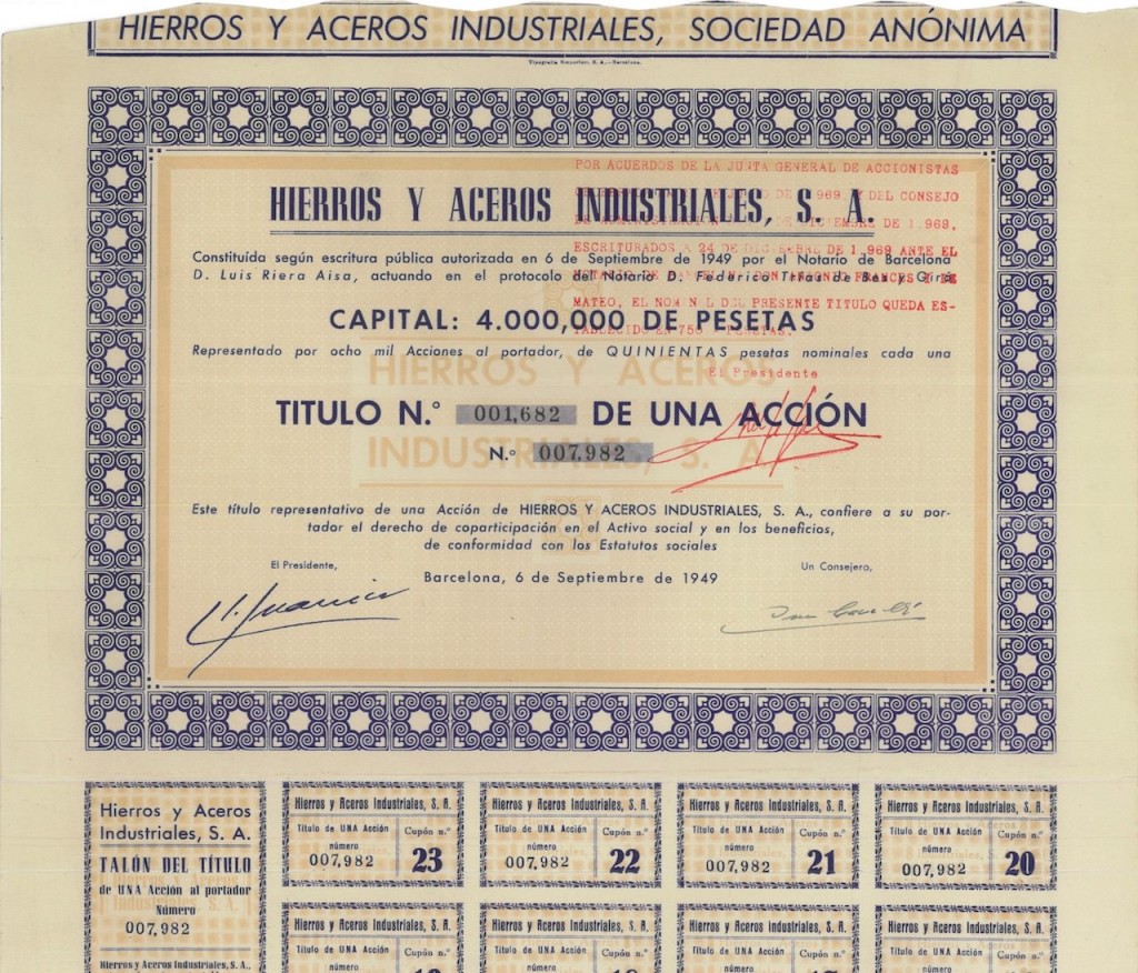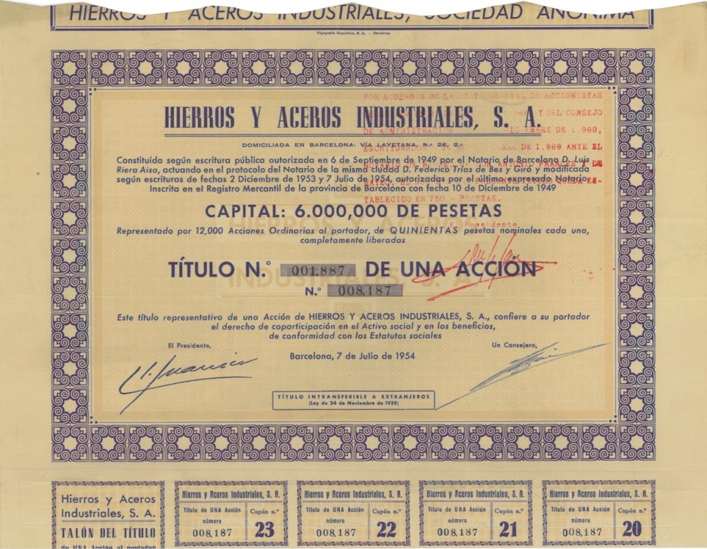 A-28326Hierros y Aceros Industriales, S. A.-1N.D.Barcellona19491 azione (cap. 4.000,000 pesetas)R1 (Più di 5000 pezzi)S1 (da 0 a 25 €)