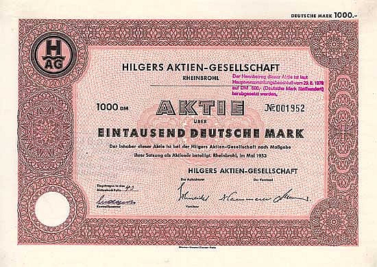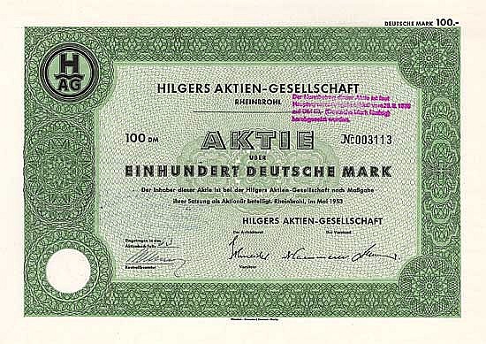 Fondata nel 1867 a Rheinbrohl, conversione nel 1888 nella “AG per la zincatura e la costruzione in ferro vorm. Jacob Hilgers ”. Fabbricazione di strutture e ponti in acciaio, contenitori e apparecchiature, soprattutto per l'industria chimica, serbatoi, lamiere grecate, finestre e cancelli in acciaio, sistemi di trasporto, gru e agitatori. Inoltre, l'attività del cantiere navale Hilgers, dove sono state completate centinaia di navi sul Reno fino alle dimensioni maggiori. Nel 1911 fusione con AG per la costruzione di ponti, perforazioni profonde e costruzioni in ferro, Neuwied (continuato come stabilimento II). Nel 1921 acquisizione dello stabilimento di stampaggio e smaltatura "Moguntia" a Mainz-Kostheim (venduto di nuovo nel 1922). Nel 1927 cambio di nome in... Altro