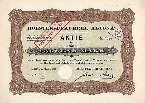 Fondata nel 1879. Nel 1925 l'azienda aveva acquisito altri dieci birrifici. Le acquisizioni sono state finanziate principalmente attraverso la vendita di terreni che non erano più necessari dopo la fusione dei birrifici. Dopotutto, la birra veniva fatta solo ad Altona, Neumünster e Kiel. Il fatto che Holsten fosse quasi un milionario negli anni '40 sottolinea l'importanza di questo birrificio anche allora. Oggi la birra Holsten viene prodotta su licenza anche in Gran Bretagna, Ungheria, Nigeria, Namibia, Cina e Paraguay. Il birrificio Holsten comprende anche Feldschlößchen AG, Braunschweig, fondata nel 1888, e il birrificio Lüneburger Kronen, Lüneburg, fondato nel 1904.