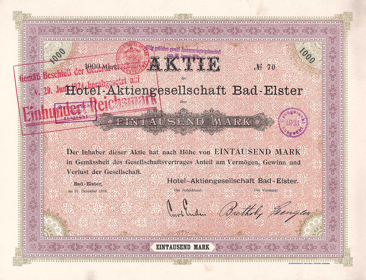 Fondata nel 1910 per acquisire e gestire gli hotel "Wettiner Hof" e "Hotel de Saxe" a Bad Elster e l'hotel "Paradies" a Karlovy Vary nella Repubblica ceca. Nel 1920 la Kurpension Königsvilla fu acquisita anche a Bad Elster e trasformata in una clinica per donne. Nel 1930, l'AG registrò un insediamento gravemente colpito dalla crisi economica globale, poi si sviluppò per alcuni anni e fu ufficialmente cancellato nel 1942. La base dell'attività balneare a Bad Elster è la sorgente di Moritz, che ha origine nella valle dell'Elster, e il medico personale del sovrano Duca Moritz di Sassonia-Zeitz scrisse nel 1669 che era noto "da tempo immemorabile". Allo stesso tempo, Bad Elster è uno dei più antichi centri di ormeggio in Germania. L'attività balneare salì alle s... Altro