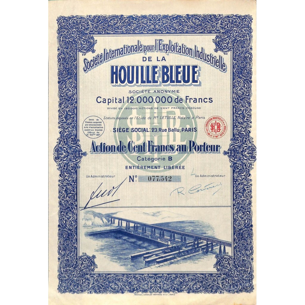 A-51093Houille bleue soc. Internaz. Pour l’exploitation industrielle-1 Parigi1927100 FranchiR1 (Più di 5000 pezzi)S1 (da 0 a 25 €)