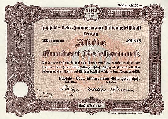 A-67169Hupfeld – Gebr. Zimmermann AG-1Lipsia19351 azione da 100 Marchi--