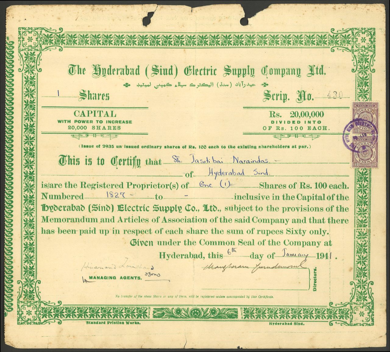 Capital 20,00,000 rupees in 20,000 shares of 100 rupees.