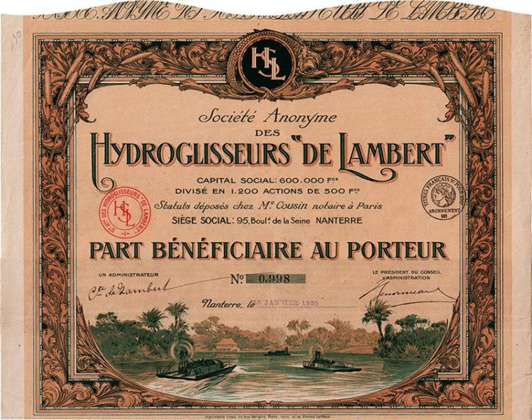 Decorativo ornato con fregi e canne. Ampia e suggestiva veduta di idroplani in navigazione. Logo in alto. Charles de Lambert (1865-1944) fu un pioniere dell’aviazione che nel 1909 volò per primo sopra la Torre Eiffel. Appassionato anche di meccanica, nel 1907 inventò l’idroplano – precursore dei moderni aliscafi. Dopo la prima guerra mondiale decise di commercializzare la sua invenzione, fondando nel 1920 a Nanterre la compagnia che portava il suo nome. Cercò di vendere la sua invenzione non solo in Francia, ma anche nelle colonie. Infatti i suoi idroplani alimentati da un potente propulsore aereo, a fondo piatto e muniti di cabine, sembravano particolarmente adatti al trasporto di merci e truppe lungo i fiumi dell’Indocina o dell’Africa occidentale. Ma l’affare sfumò a causa del fortissimo rumore emesso dai natanti.