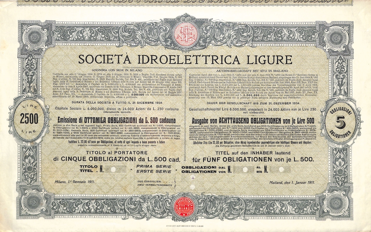A-7517Idroelettrica Ligure Soc.-1Officina Carte Valori Rebeschini di Turati e C. - MilanoMilano19115 obbligazioni al portatoreR1 (Più di 5000 pezzi)S1 (da 0 a 25 €)