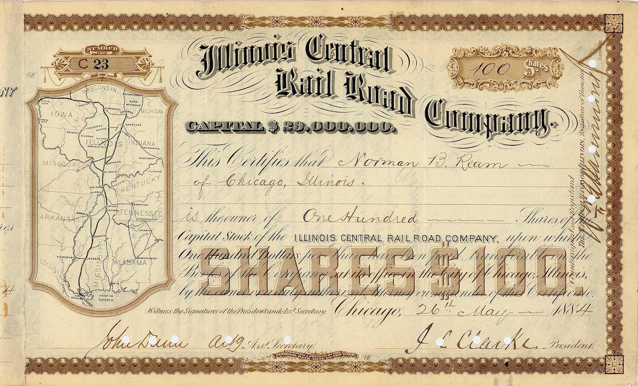 Concesso nel 1850. La compagnia ricevette ampie donazioni di terre dal congresso a condizione che il percorso di 700 miglia potesse essere completato entro 6 anni – e ci riuscì. Alla fine del secolo, la rete di rotte era cresciuta a quasi 2.000 miglia con le linee principali Centralia, Illinois. A Dubuque, Iowa (340 miglia), Chicago-Cairo, Illinois (364 miglia) e più lontano a New Orleans (548 miglia). Dopo la seconda guerra mondiale (le due rotte più importanti ora correvano da Chicago a New Orleans e verso Sioux Falls e Omaha, Neb.), la struttura della compagnia fu notevolmente semplificata e furono incorporate quasi una dozzina di ferrovie sussidiarie. Nel 1972 avvenne la fusione con il Golfo, Mobile e Ohio RR per formare l’Illinois Central Gulf RR. Passò tra diversi proprietari incompetenti prima del Canadian National Ry nel 1998.