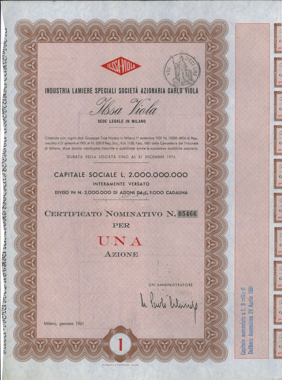 A-12989ILSSA Viola – Industria Lamiere Speciali S. A. Carlo Viola-1Calcografia & Cartevalori - MilanoMilano19611 azione da Lire 1.000R2 (1001-5000 pezzi)S2 (da 26 a 50 €)