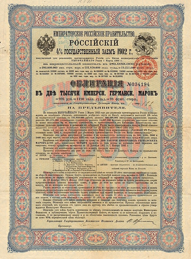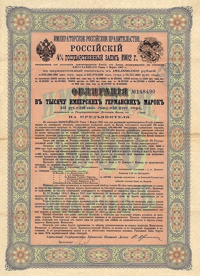 Il prestito fu emesso per la riparazione da parte della Cina dei danni causati dalla ribellione dei Boxer nel 1900. Ai lati del documento appaiono l’aquila imperiale russa e il drago cinese.