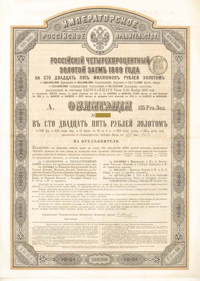 A-31113Imperial Government of Russia, 4% Gold Bond-1Russia1889125 RoublesR5 (101-250 pezzi)S5 (da 251 a 500 €)